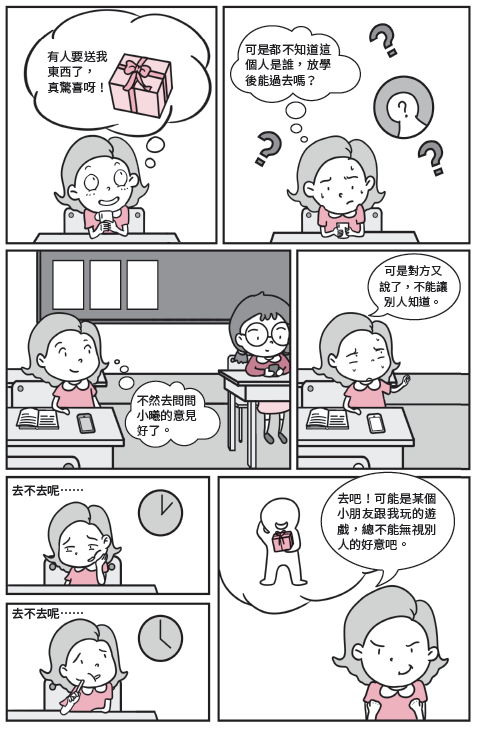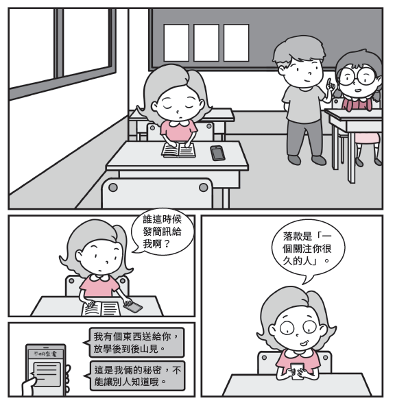 萱萱的手機突然收到一條陌生簡訊:我有個東西送給你,放學後到後山見。這是我倆的秘密,不能讓別人知道哦。署名是「一個關注你很久的人」。發現有人要送東西給自己,萱萱很興奮。但沒過多久,她就猶豫了:「都不知道是誰,能去見嗎?」萱萱想找小曦商量,但對方說過,不能讓別人知道。她思來想去,還是決定放學後去看看,因為她覺得不能無視別人的好意。