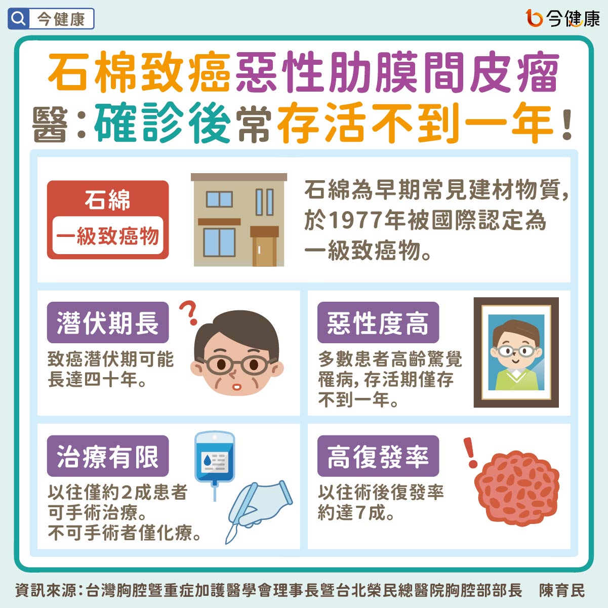 惡性肋膜間皮瘤雖罕見,但其高度致癌因子卻一直潛藏於民眾生活中,台灣胸腔暨重症加護醫學會理事長暨台北榮民總醫院胸腔部部長陳育民說明,石䃇為早期建築、裝潢工程常用物質,1977被國際認定為一級致癌物後,台灣也在民國65年起,將此材料納入法規管理,但由於石䃇潛伏期可能長達四十年,因此多數患者大多進入高齡才驚覺罹病,存活期僅存不到一年。