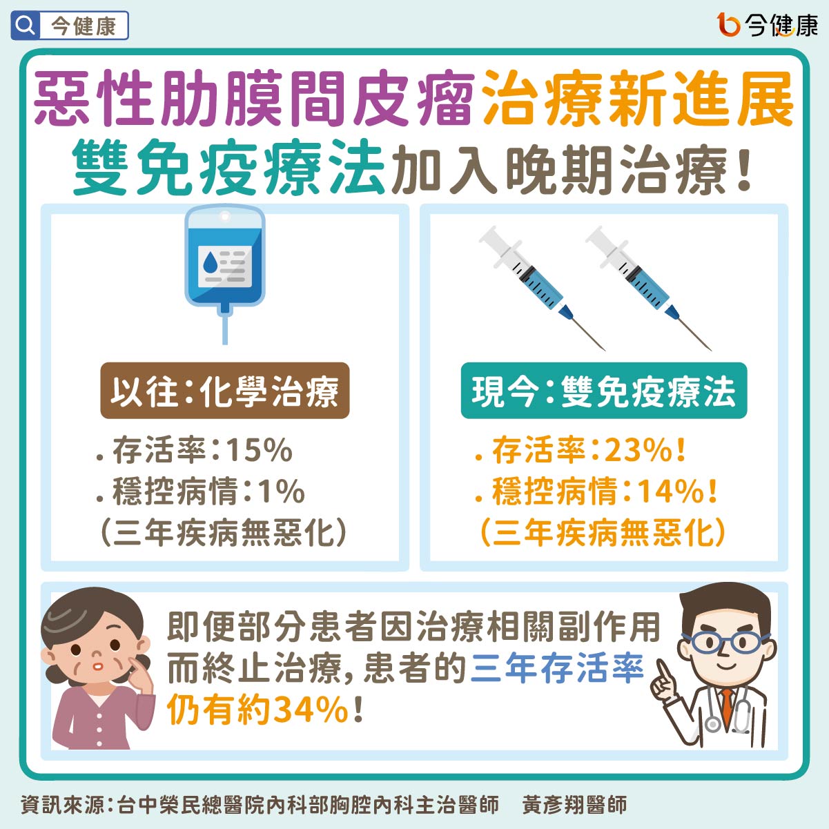 所幸,隨醫療發展日新月異,免疫治療近年加入晚期惡性肋膜間皮瘤治療行列。黃彥翔醫師表示,數據指出,相比化療,惡性肋膜間皮瘤患者接受雙免疫療法後,不僅三年存活率得以從15%提升至23%、降低27%死亡風險外,病況獲穩定控制、三年疾病無惡化的比例更從原先的1%提高到14%,即便部分患者因治療相關副作用終止治療,這些患者的三年存活率仍有約34%,與過去存活期不超過一年的狀況相比,雙免疫療法終於成功為惡性肋膜間皮瘤患者突破十年來的困境、成為惡性肋膜間皮瘤患者新希望。