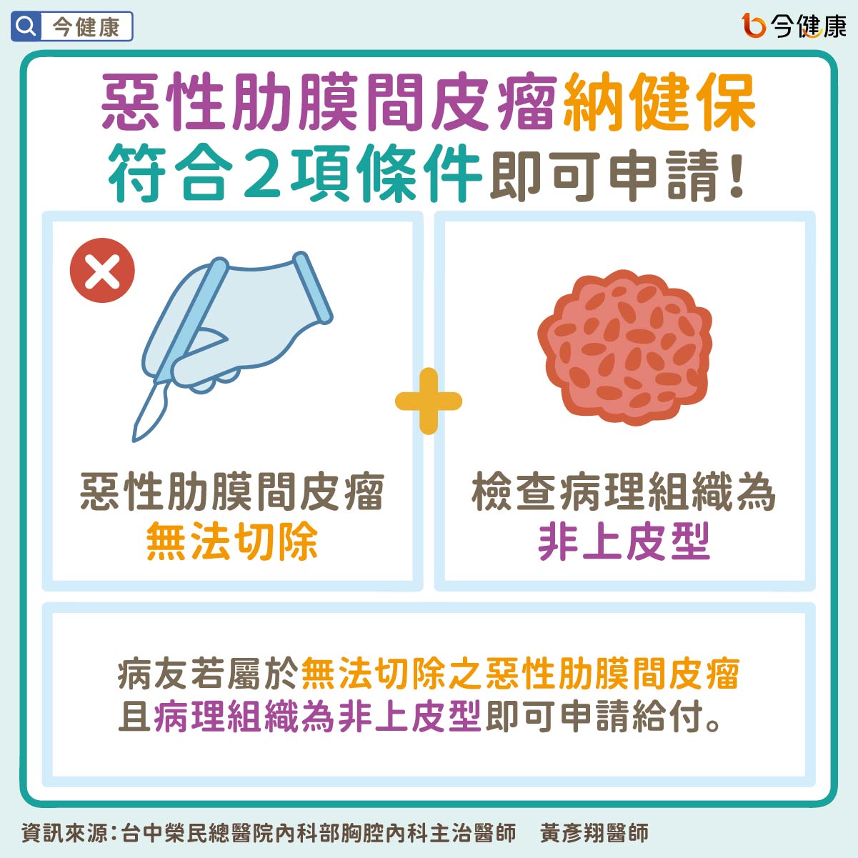 近日健保署看見癌友困境,首度將雙免疫治療納入惡性肋膜間皮瘤一線給付,病友若屬於無法切除之惡性肋膜間皮瘤且病理組織為非上皮型即可申請給付。黃彥翔醫師說:「患者過去可能因經濟考量使治療選擇受限,如今健保第一次將雙免疫治療列入惡性肋膜間皮瘤給付範圍,鼓勵病友及家屬們勇敢面對並配合醫師安排,選擇最適合自己的治療方案,並可積極討論是否適用健保給付。」陳育民理事長亦表示,相信雙免疫納入健保給付將成為患者抗癌路上的最大後盾,鼓勵惡性肋膜間皮瘤患者不要輕易放棄,都有機會揮別癌症陰霾!