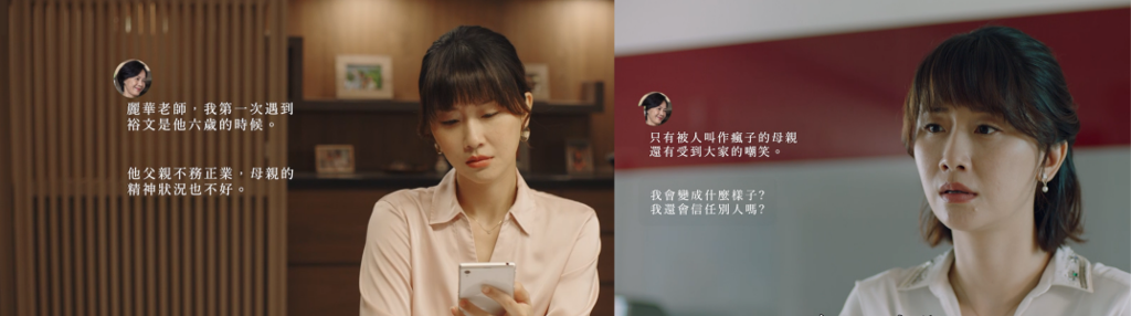 柯淑勤用手機訊息告知朱芷瑩,「新芽課輔班」學生家庭背景,對照朱芷瑩在劇中高社經地位與提供兒子衣食無缺的生活,教學態度開始戲劇性轉變。