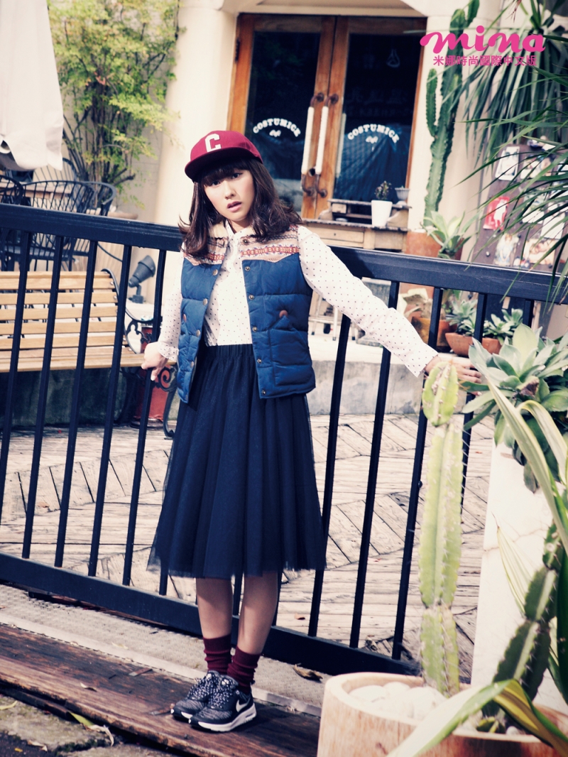 天氣很冷怎麼穿都是包得緊緊的?取代厚重的大衣外套以圖案設計舖棉背心搭配,休閒感UP!再以紗裙融入更多的Girly Style。 黑白點點棉質襯衫 NT.790/UNIQLO 毛領針織圖騰鉤紋舖棉背心 NT.990、酒紅色字母棒球帽 NT.690/皆為WHO.A.U 黑色過膝鬆緊紗裙 NT.2280/URAHA 酒紅色短襪/編輯部私物 黑色編織感球鞋 NT.3550/NIKE