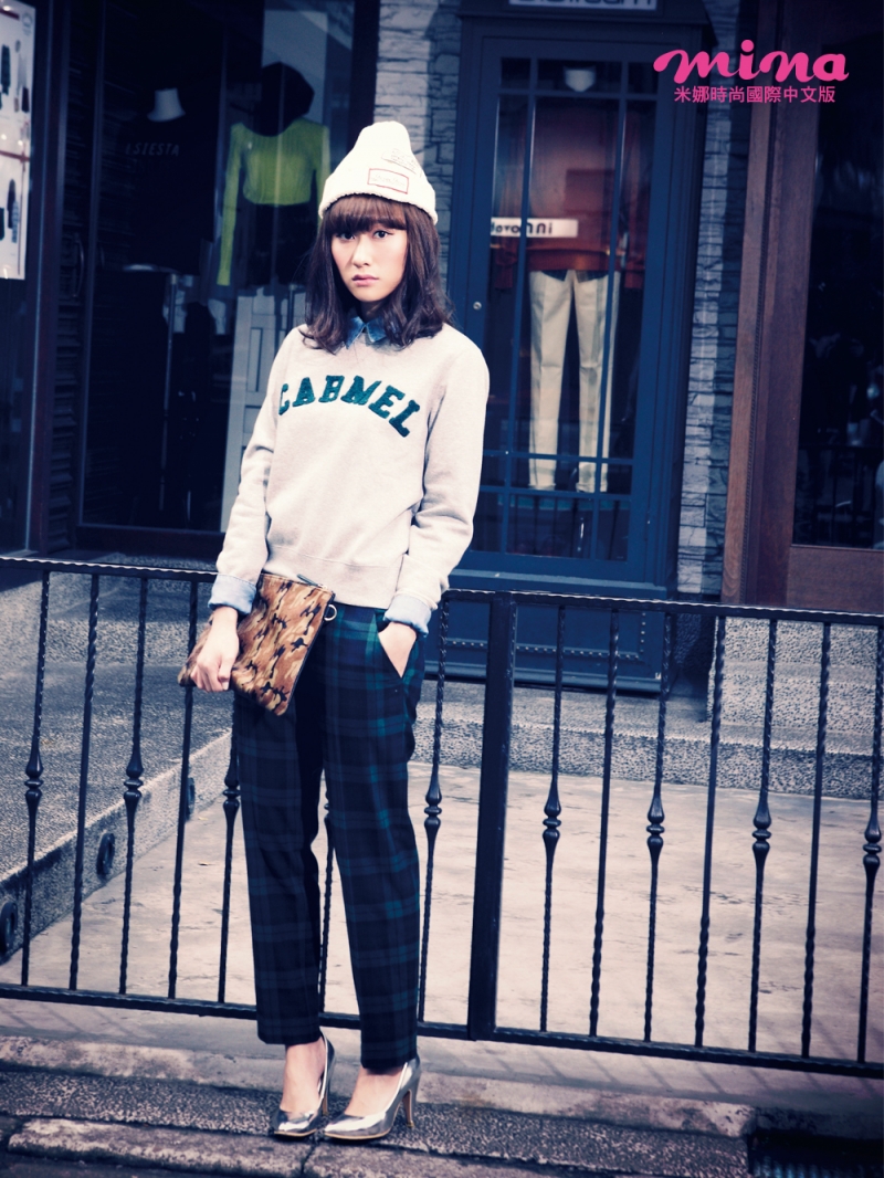 既然是端裝的格紋西裝褲,上身就以棉質T恤&休閒丹寧襯衫搭配,打造出ON、OFF都適合的裝扮。最後再以毛線帽完成Relax的隨性風,多變化的穿搭一定要學習。 內搭丹寧長袖襯衫 價格電洽/UNIQLO 灰色字母圖樣棉質T恤 NT.1880/earth music & ecology 經典綠格紋西裝褲 NT.990/UNIQLO 米色粗毛線針織帽 參考商品/Lea 咖啡色迷彩皮草手拿包 價格電洽/Lea 銀色尖頭高跟鞋 NT.1280/D+AF