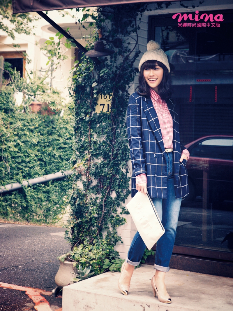格紋╳格紋的交叉穿搭意外地十分搶眼!因為是撞色系,細格紋與大格紋搭配,其實不會太過花俏,反而能提升層次感Highlight整體穿搭喔。 紅色細格紋棉質襯衫 NT.2580/cantwo 深藍色大格紋西裝外套 NT.686/EYESCREAM 刷色丹寧休閒褲 NT.2690/Lowrys Farm 米白色粗鉤織帽 NT.490/WHO.A.U 白色細版腰帶 NT.790/UNIQLO 白色手拿包 參考商品/Lea 金屬拼接粉色高跟鞋 NT.1280/D+AF