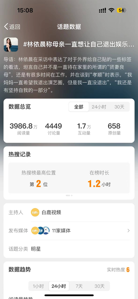 ▲ 林依晨接受媒體《一條》專訪,相關話題立刻登上微博熱搜第二名。(圖:周子娛樂)