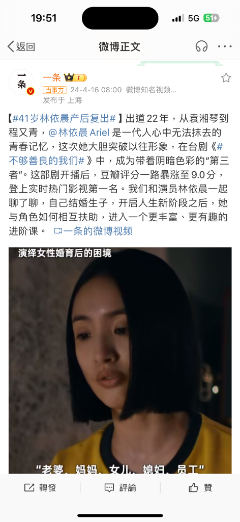 睽違多年,金鐘視后林依晨以《不夠善良的我們》回歸台劇,劇中不僅二搭導演徐譽庭、許瑋甯、賀軍翔,所飾演的簡慶芬一角更是讓觀眾看得入戲,引起網上一陣討論,豆瓣評分更衝上高達9分的佳績。林依晨近期接受媒體《一條》的專訪表示,我很開⼼在適當的時機點她來到我⾯前,我看到的時候就覺得太過癮了,我⼀定要演。讓粉絲們直呼林依晨真的每個時期都有代表作,「20袁湘琴、30程又青、40簡慶芬」等相關話題也隨即登上微博熱搜第二名。