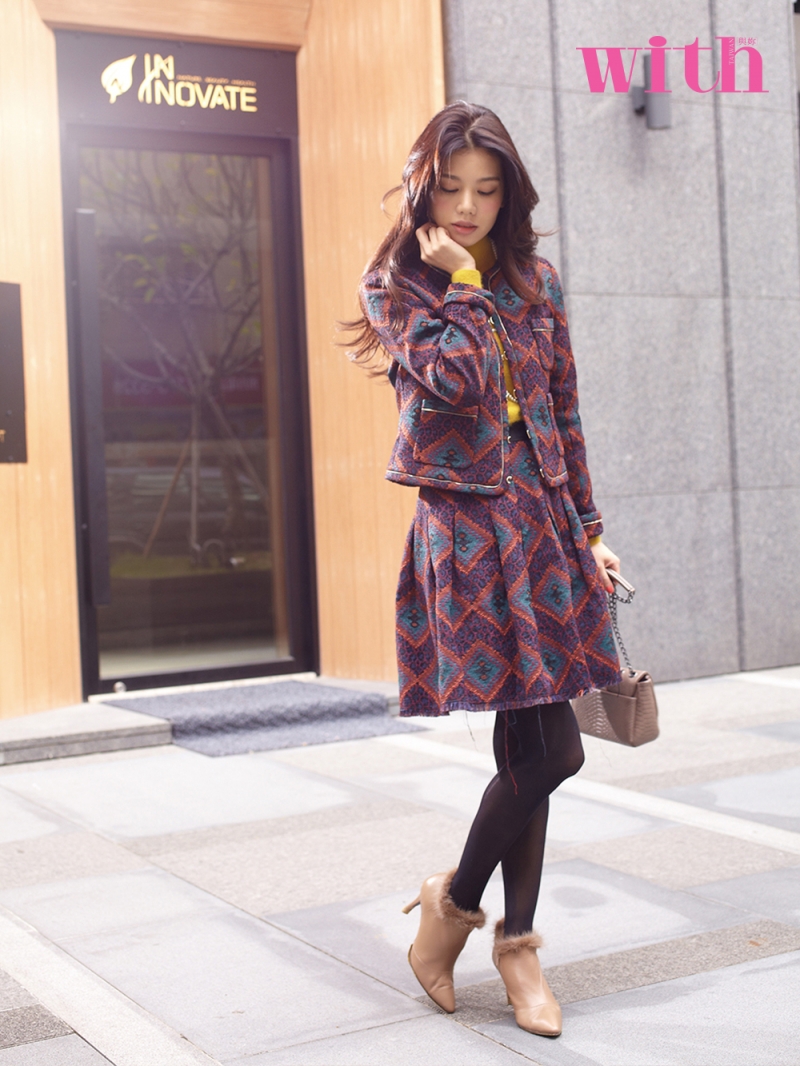 短版緹花外套 NT.8900、緹花圓裙 NT.6980/CHLOE CHEN 芥末黃高領兔毛衫 NT.3280/#nude 珍珠串鍊 NT.電洽/Pinky House*Chen 卡其色鍊帶包 NT.電洽/Folli Follie 卡其色毛毛踝靴 NT.5680/ANNAlee