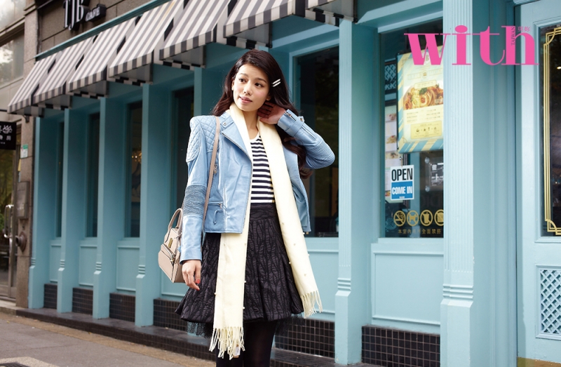 水藍色皮外套 NT.15800、白色圍巾 NT.1080/J’adore美魔女 條紋圓領上衣 NT.650/MUJI 黑色紗裙 NT.5500、BABY POUCH BAG NT.11000/DRESS CODE 珍珠髮飾 NT.電洽/Pinky House*Chen