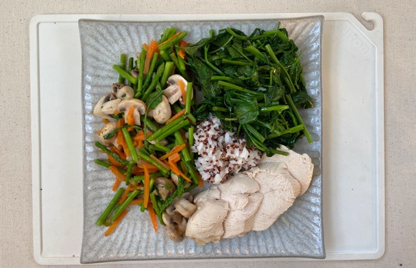 接著我會依當天想吃的主食來訂主題,像是雞胸肉、蝦仁、魚片、豬里肌…等為主角,也可以做素食版本,然後搭配不同蔬菜為主的配菜,我希望減重餐盤是多種顏色的食材組合在一起,才會有食慾,因為減重已經很辛苦了,必須讓我一看就想吃光光。