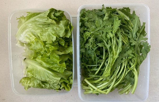 - 綠色葉菜類兩種或綠花椰菜,每種600 克,去除黃葉和損壞葉後清洗, 瀝乾水分,放入大保鮮盒,冷藏保存。
