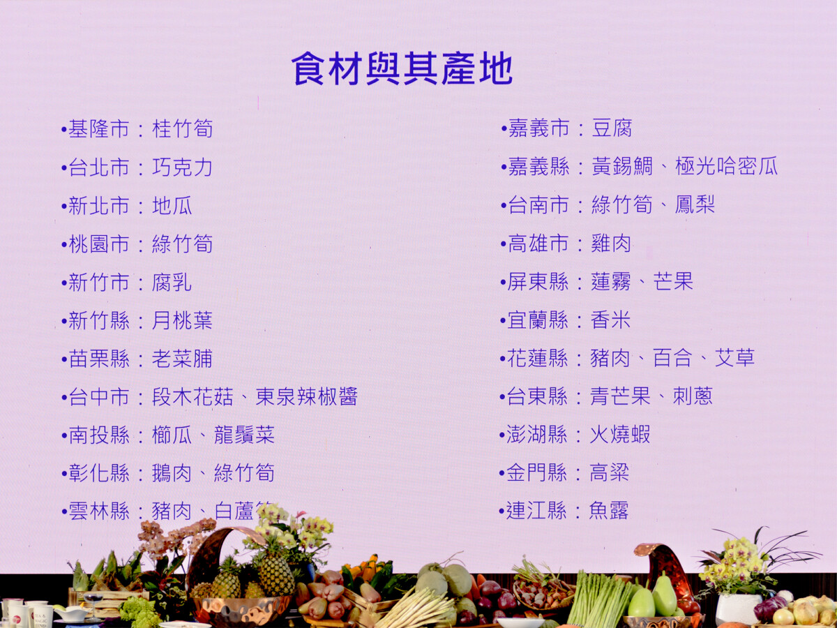 ▲福爾摩沙遊艇酒店展示總統及副總統就職國宴,使用台灣食材的產地。(記者劉秋菊拍攝)