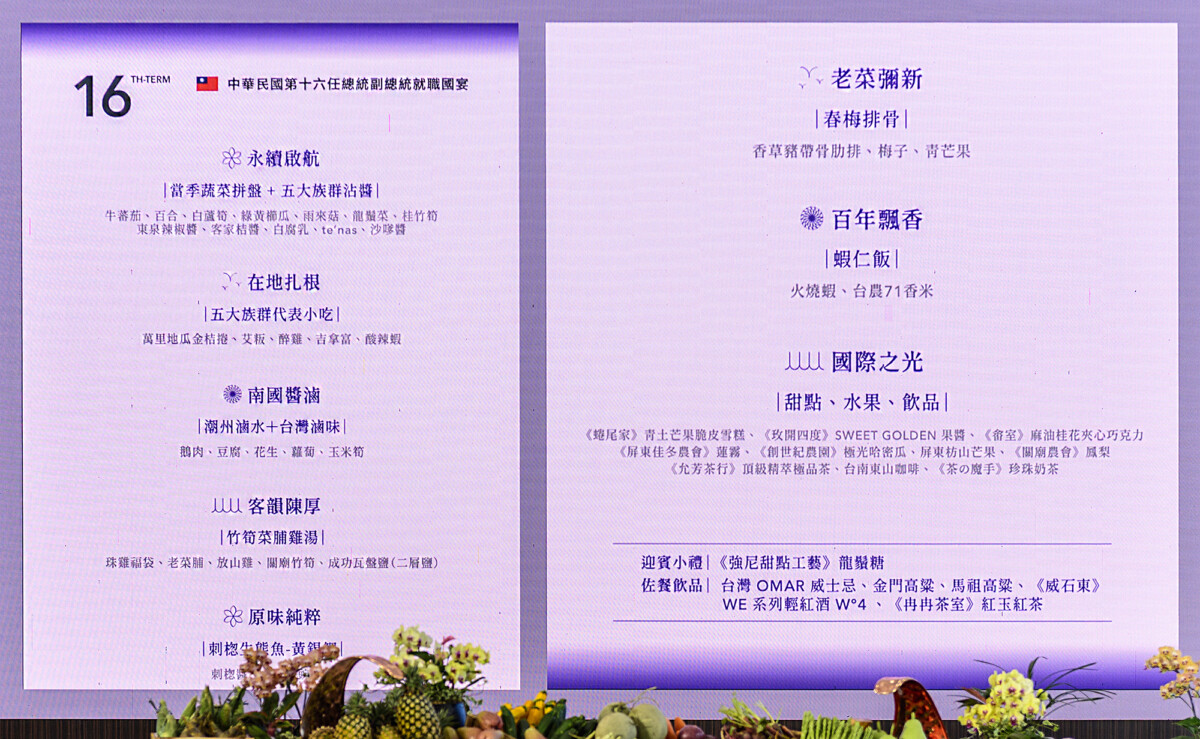 第十六任總統副總統就職籌備會表示,國宴菜單設計共有八道主菜,菜色理念融入「民主包容、族群融合、地方特色、綠色永續、傳統創新、展望國際」六大關鍵詞,第一道主菜「永續啟航」以當季蔬菜拼盤搭配五大族群沾醬(閩南、客家、外省、原住民、新住民),第二道菜「在地紮根」則是五大族群代表性小吃;第三至第七道菜分別為「南國醬滷」結合潮州滷水和台灣滷味、「客韻陳厚」竹筍菜脯雞湯、「原味純粹」刺楤黃錫鯛 、「老菜彌新」春梅排骨、「百年飄香」蝦仁飯,盡顯台灣美食的廣度與多樣性;最後第八道則是「國際之光」甜點與水果,展現台灣在國際上逐步被看見的能量,希望透過國宴菜色的設計讓賓客充分品味台灣美食魅力。