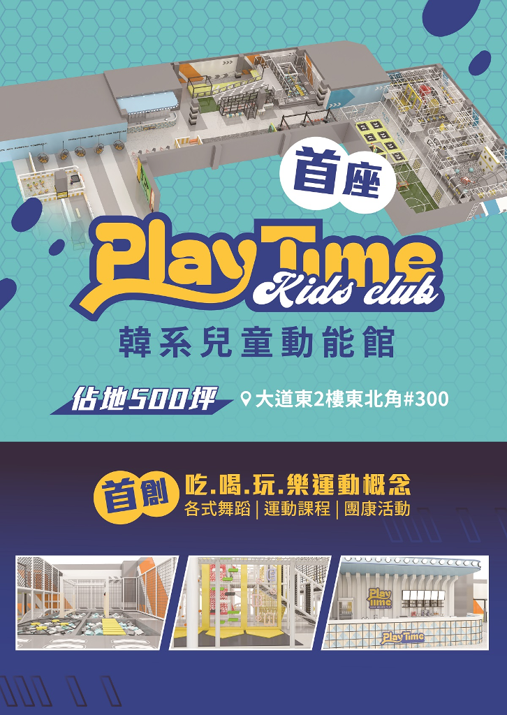 新櫃登場!全台獨家「韓系兒童動能館PlayTime Kids Club」,引進韓系運動、娛樂概念設計,打造最好玩、刺激、最適合孩子們放電的動能樂園。場館佔地500坪,使用科技智能拋棄式手環,暢玩館內10大主題:五彩繽紛挖沙吧、美式餐飲、趣味滑行區、極限體能闖關、趣味障礙體驗、體適能燃脂區、世界盃足球小將、NBA黃金射手、派對活動區、感統區、家長休憩區。 有吃有喝有玩,以及多元的舞蹈、運動課程、團康活動,等著爸媽跟寶貝們來探索體驗。