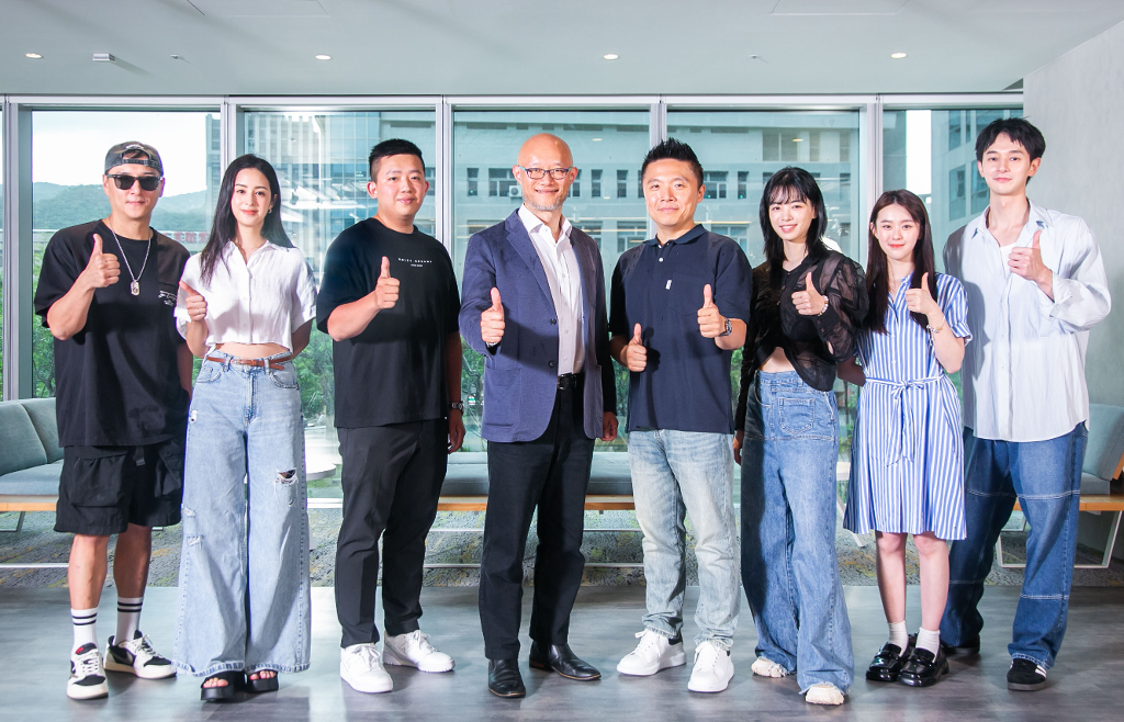 ▲ 由左至右鄭人碩、莫允雯、文策院代表、LINE台灣執行長陳立人、導演李昭樺、陸夏、邱偲琹、張軒睿。(圖:LINE)