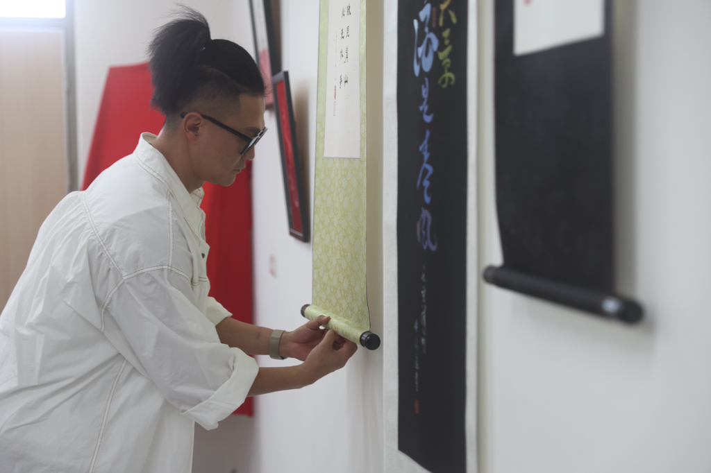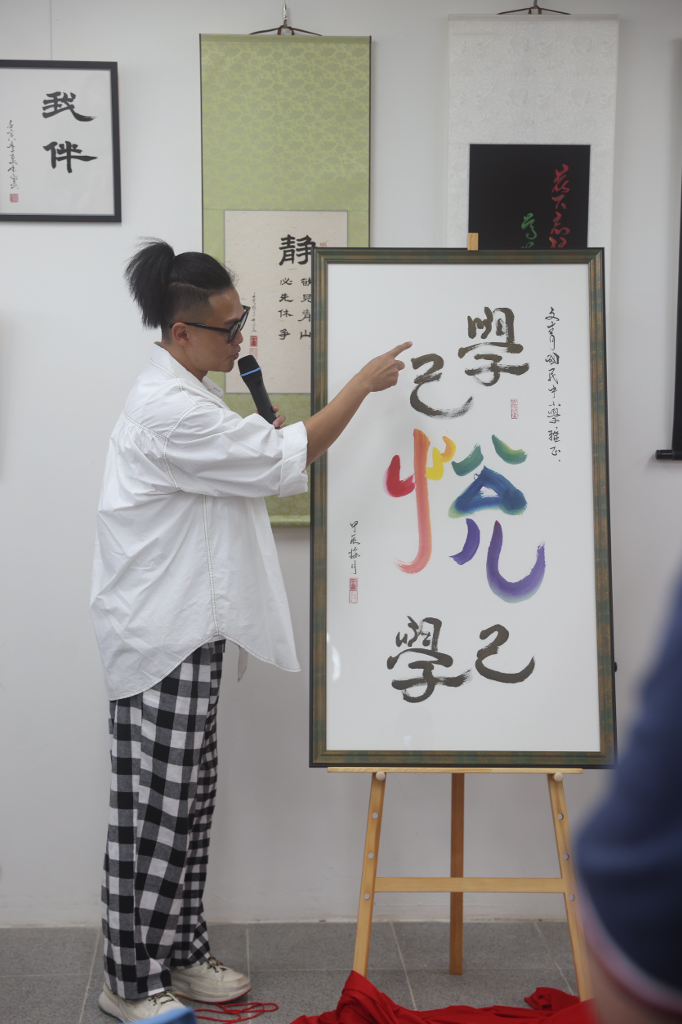 美聲歌手林俊逸喜愛用毛筆寫字,練得一手好書法,經常在FB直播寫字給粉絲們競標,他的書法作品還曾經賣到6位數的價格,可說是最強斜槓。今日(5/9)受邀至桃園市立文青國民中小學辦理《上好的一年》書法展,為了歡慶文青國中小首次校慶,林俊逸特別贈字「學己悅己學」,其中「悅」字為多種色彩融入之手法展現,以此祝福文青國中小的孩子們都能樂於學習,喜悅沉浸在知識當中,除此之外還有其他非常有特色的書法作品,值得到現場來欣賞感受。