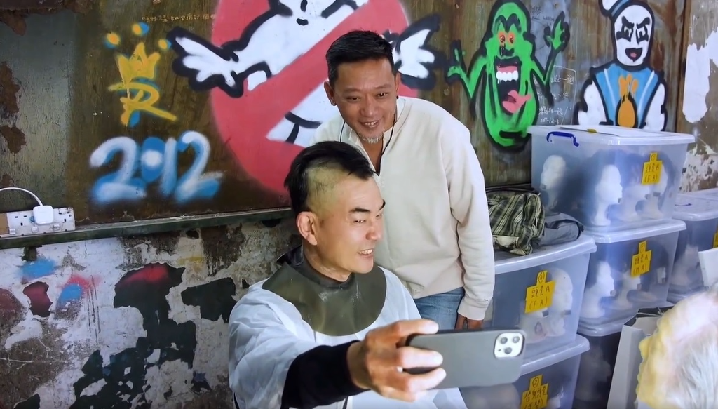 me?」接著又拿出自己的手機,跟導演自拍留下龐克頭的紀念,最後才讓鄭保瑞把剩下的頭髮全剃光。