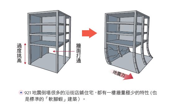 比較擔心的是某些老舊建築的一、二樓磚牆被任意拆除作為賣場、超商、餐廳等,大地震來時,一、二樓少了原來的磚牆來分擔地震衝擊,或是像有些公寓一樓連排房子、好幾個門牌,一起打通成一個店面(921 地震倒塌很多的沿街店鋪住宅,都有一樓牆量極少的特性,也是標準的「軟腳蝦」建築),或是懸挑式騎樓的老舊大樓(如花蓮大地震的統帥飯店)、開放空間大樓、或使用不當的住商混合大樓,就很容易有「軟弱層」,在地震時發生倒塌。