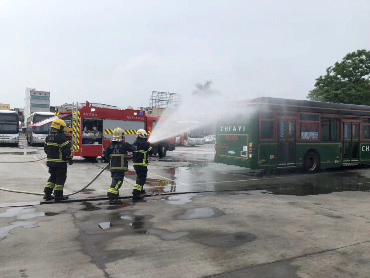 圖:嘉義市政府自109年第一條電動公車路線上路前即攜手本市消防局與國光客運共同辦理消防安全演練,今日與國光客運辦理電動公車救災演練,演練課題包含行進間起火的緊急應變、事故通報、乘客疏散、消防搶救現場救護等實際作業,藉以強化防災及救災技巧。(記者吳瑞興翻攝)