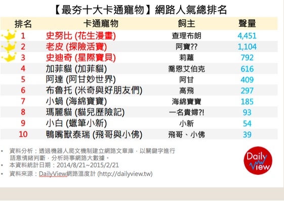 到底在寵物奴的眼裡,哪一隻卡通寵物獲得最多青睞呢?今天DailyView網路溫度計就要來頒發最佳寵物獎!