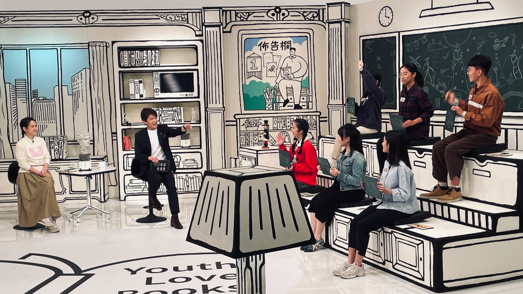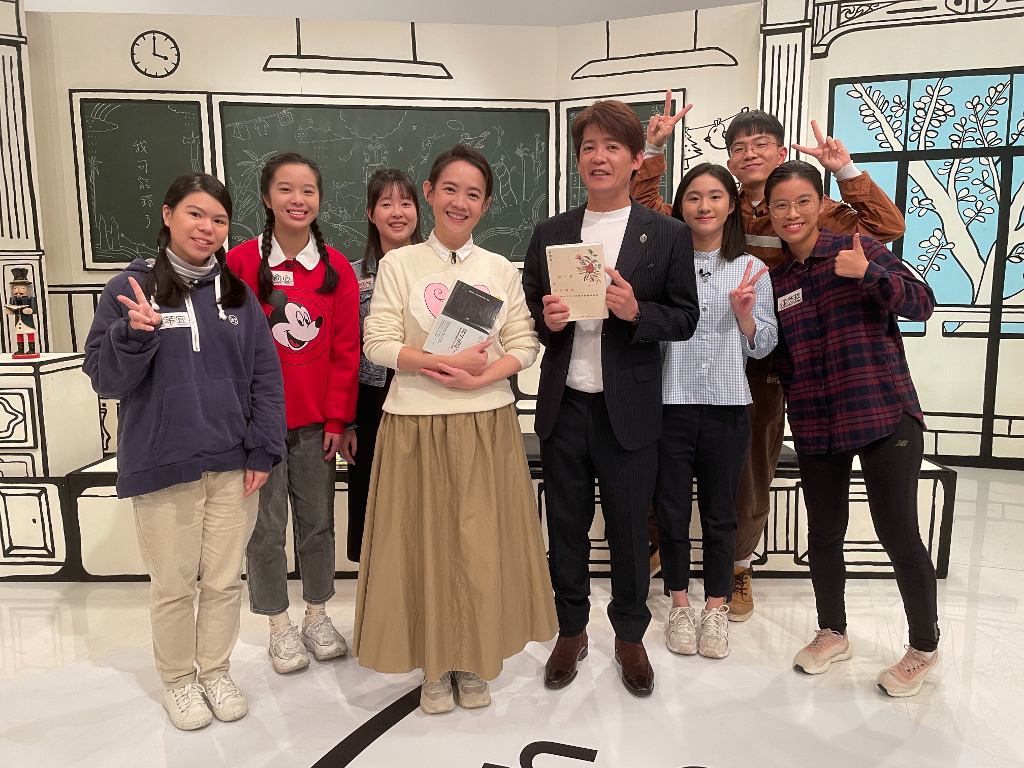 (曾寶儀(左)跟「青春愛讀書」現場錄影的高中生一起分享讀書心得)