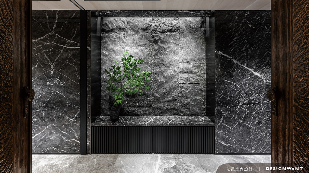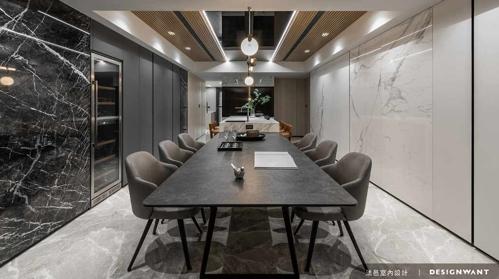 出入口以雙開門的方式迎接眾人,首先映入眼簾的是帶有鑿面紋理的深色石皮,左右兩邊分別延伸進內部空間,作品藉由第一視覺印象給予訪客尊榮不凡的高級感,旋身至餐廳,跨距極大的餐桌可以容納約12人左右共同用餐暢飲,牆體兩側輔以石紋切割立面,隱藏梁柱、增加收納機能,天花板則安排茶鏡,投射光源與室內情境,延伸視覺尺度,空間以對稱的方式傾注尊榮風貌。