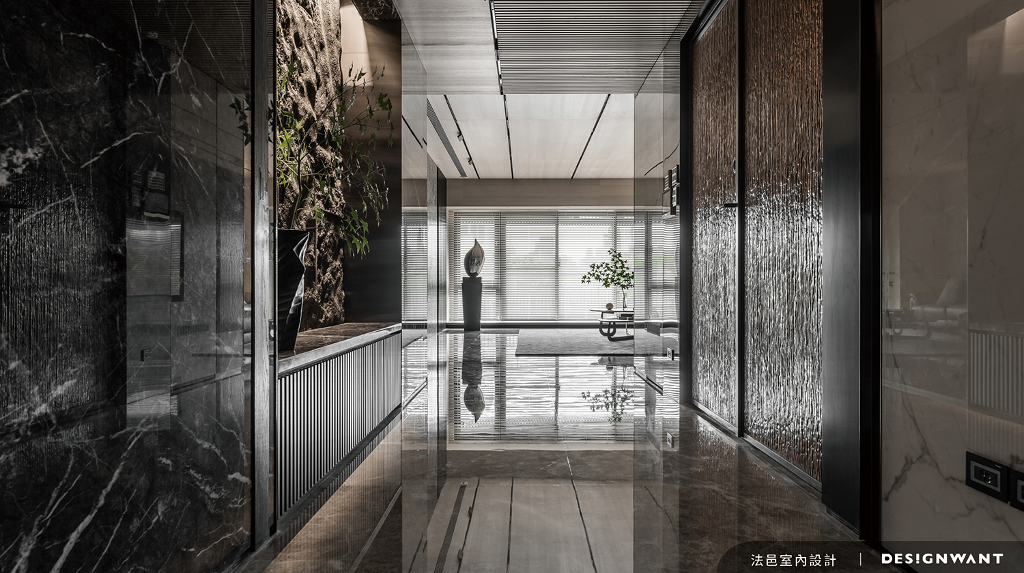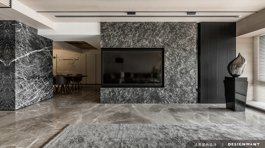 精緻中蘊含對細節的追求,敞亮布局之下精準描摹輪廓線,設計端熟稔地運用大理石特性搭配簡練的立面,緊扣屋主喜愛深色調的初衷,將寬廣的客廳連結大面積採光落地窗,利用百葉窗簾形塑出光影粼粼的視覺效果,加乘無拘無束的廣闊感。