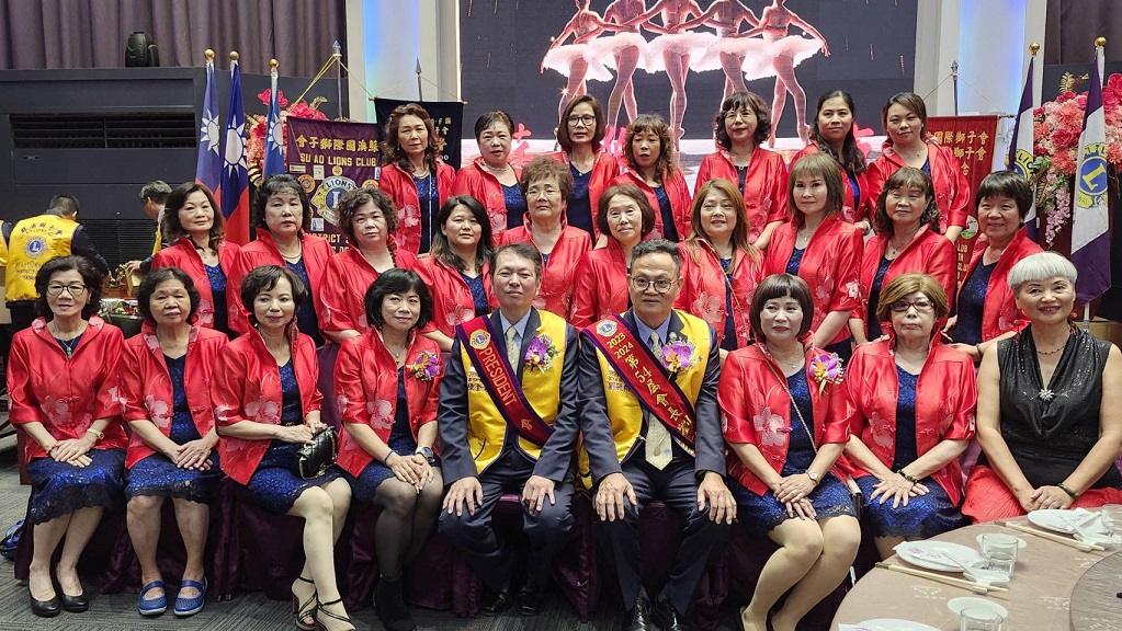 ▲蘇澳會獅嫂統一鮮紅制服上台與新舊會長合影紀念。