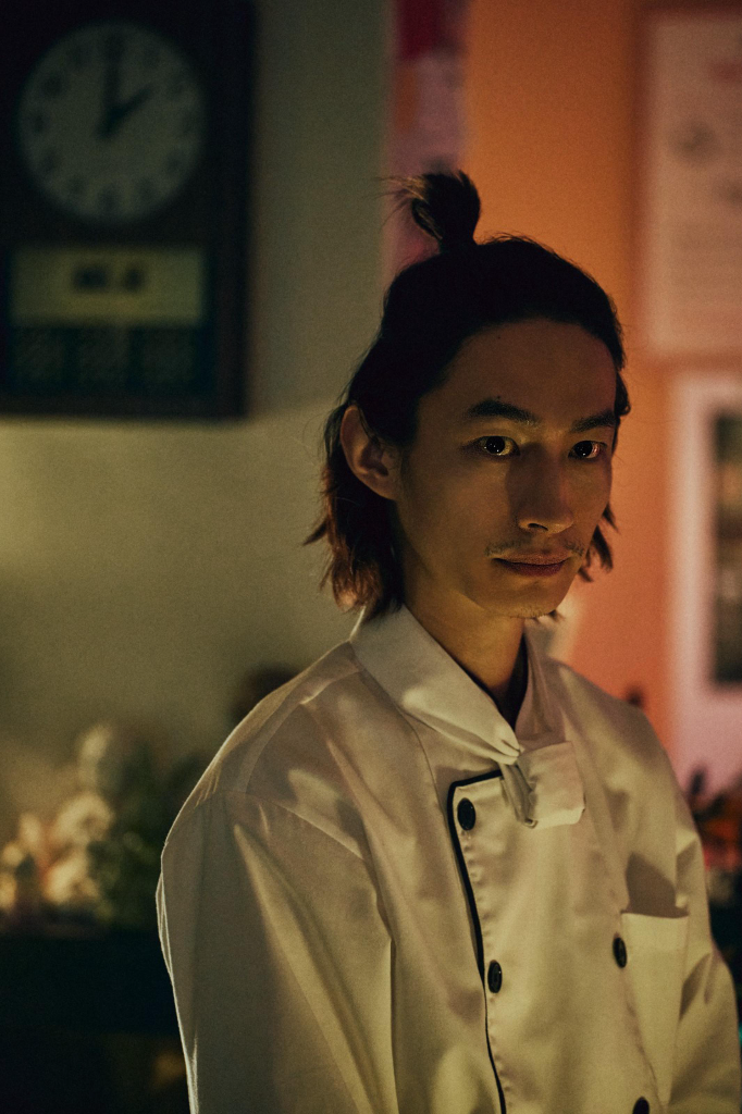 主視覺上亦有恐怖表情的黃河,此次飾演高級餐廳主廚,