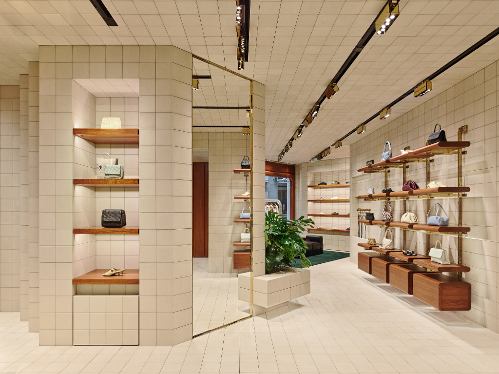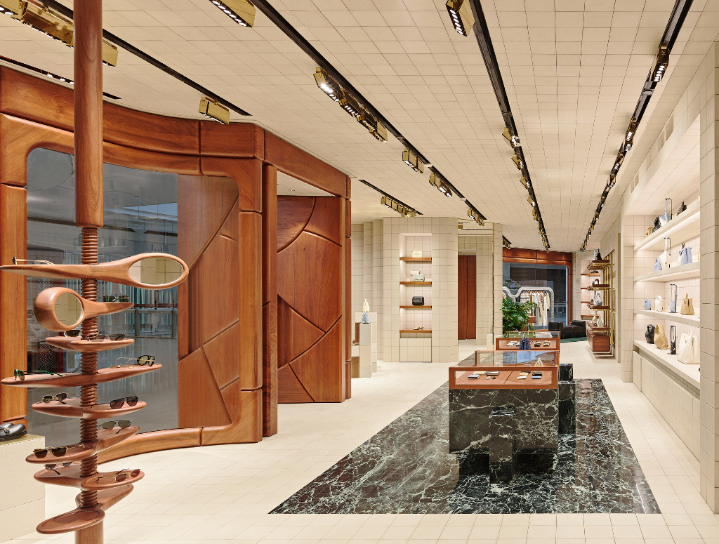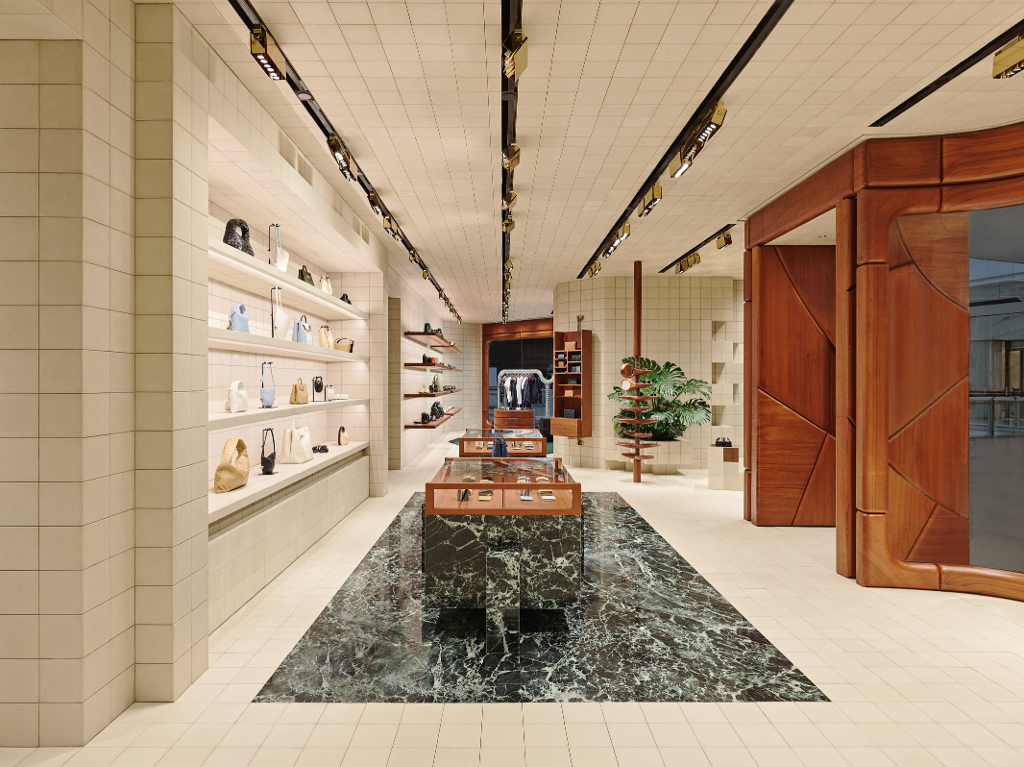旗艦店由創意總監Matthieu Blazy悉心打造,融合了經典的義大利質材和現代主義風格,體現了品牌對創新和工藝的承諾。全店以三種元素構成:混凝土磁磚、義大利胡桃木和取自瓦萊達奧斯塔山谷的綠色聖丹尼斯大理石。