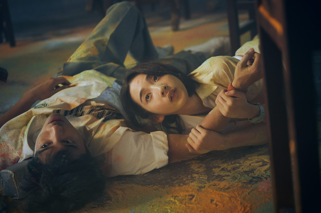 ▲ 李沐(右)與婁峻碩有場在粉筆灰中打鬥的戲碼。(圖:百薇國際娛樂)