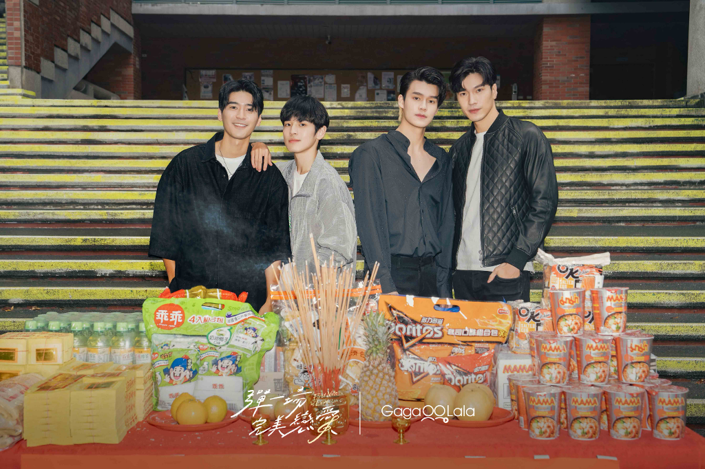▲ 涂善存(左一)、張豐豪(左二)、Jame Kasama(右二)、劉泯廷(右一)橫跨台泰與影歌各界藝人熱鬧參演,帶來充滿火花的高顏值黃金卡司群演組合。(圖:GagaOOLala)