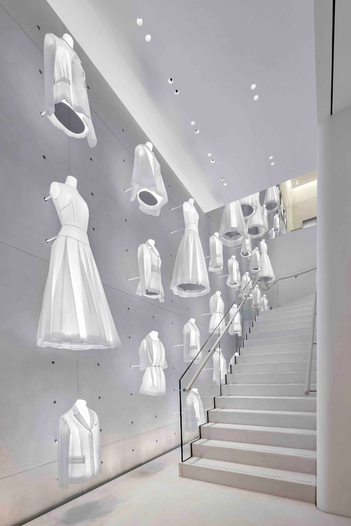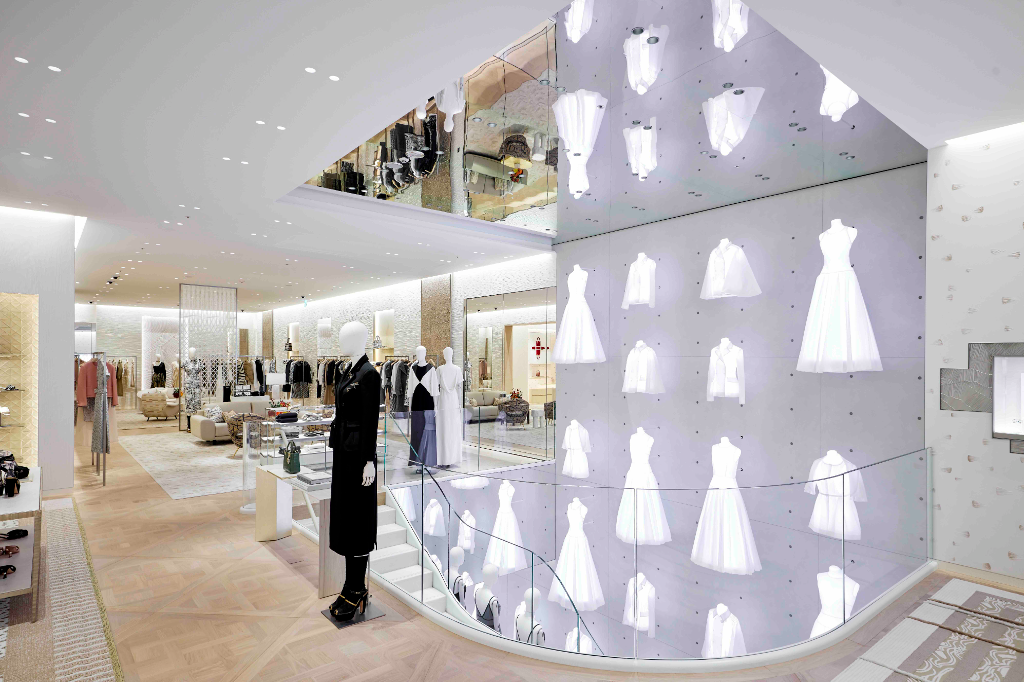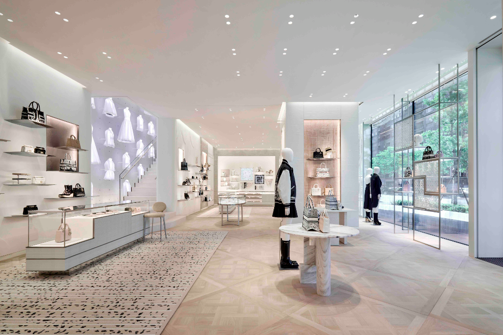 店裝空間揉合品牌歷史與超現代精緻風格,輔以Dior符碼與風格進行昇華,例如凡爾賽宮的木鑲地板與彰顯著品牌底蘊的高級訂製工坊打造的純白胚布裝飾著一路延展至二樓的旋轉樓梯,這些巧思都是向品牌位於巴黎蒙田大道30號總店致敬的設計。淡雅色調營造明亮且溫暖氛圍,佐以柔和的白、奶油白與灰色調家具,結合大膽與細緻精神。
