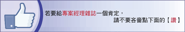 【歡迎按讚加入專案經理雜誌Facebook,每天可閱讀一篇專案實務案例及Renew自學PDU:《www.facebook.com/ProjManager 》;更多精采報導,請上《專案經理雜誌:www.pm-mag.net》。未經授權, 請勿轉載!】