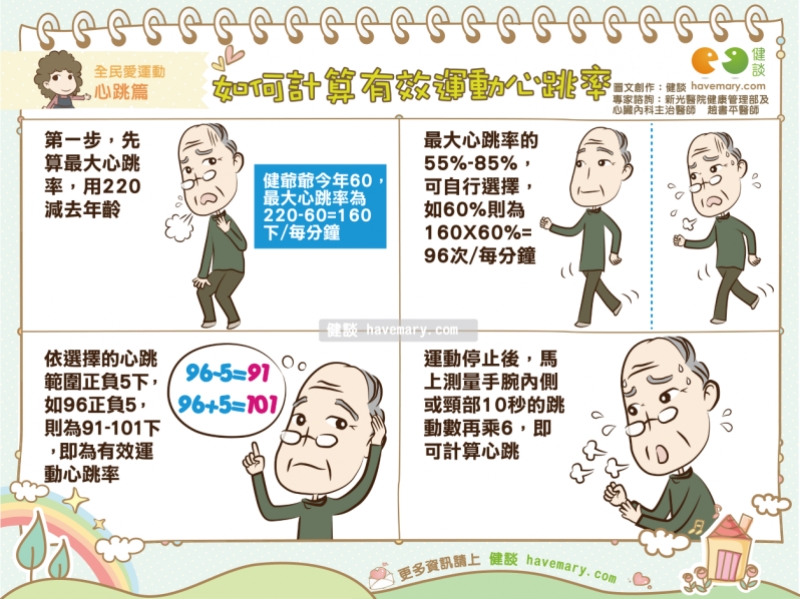 第一步,先算最大心跳率,用220減去年齡,例如:健爺爺今年60,最大心跳率為220-60=160下/每分鐘。