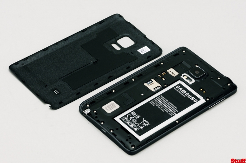 手機背面同樣具有可拆式背蓋設計,拆開之後可以看到電池容量為3,000mAh的長條型電池,NFC天線也設計在電池上面。