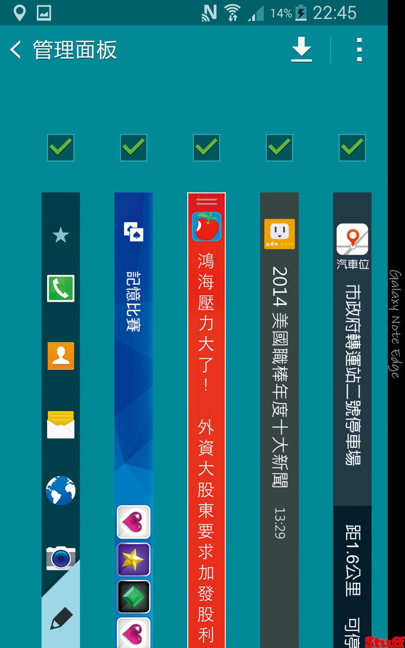除了內建的功能之外,許多在地的內容App也與Samsung進行合作,下載App之後,可以套用面板並且在曲面側螢幕上顯示,像是「蘋果日報」、「UDN News」、「NODER訊息小幫手(整合LINE、Whatsapp、Facebook Messenger) 」、「搭車吧,台北(提供車位、公車、YouBike資訊) 」、「行動股市」、「星太鼓」遊戲,還有12個月不同的Edge動態主題面板可以更換,讓Edge的玩法更加豐富。