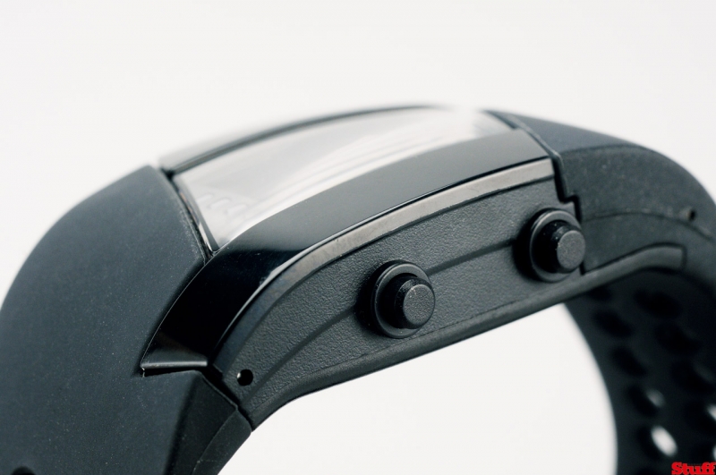 PS-500能夠顯示時間和日期,而透過右側的A、B鍵,則可切換對應的健康管理功能,而錶帶採用類似電子錶的橡膠材質設計,可自由調整適合的尺寸。