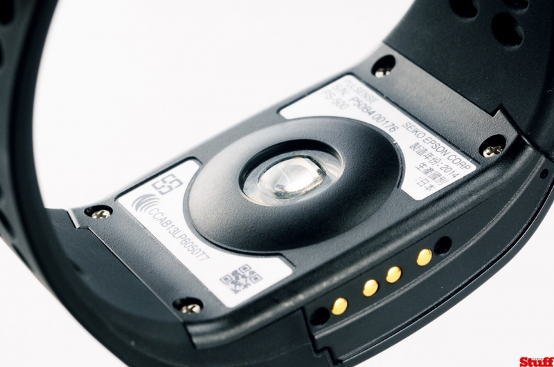 在手錶背後可以看到一個LED偵測器,會透過綠光來測量使用者的心率,測量血液在血管當中流動,隨血管擴張造成血流量降低的反射量變化。