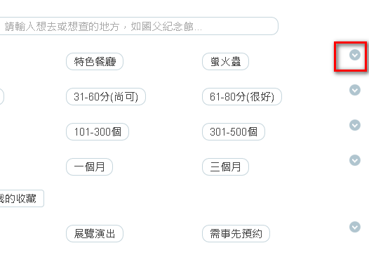 下面有一些過濾的條件,如果你要去那個地點的附近用餐,則可以加選擇「供餐」,或者要找有「兒童遊樂設施」的,都可以。每個過濾條件右邊都有一個「箭頭」,按下去會有更多的過濾條件出現。