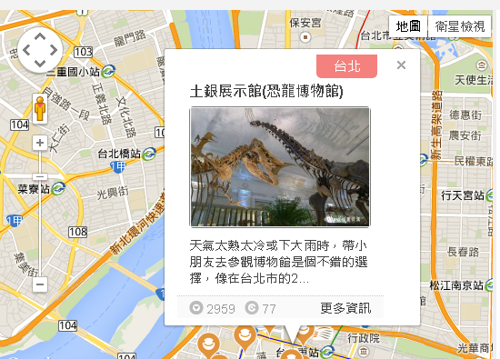 點任何一個「景點指標」圖示,就會浮起一個小視窗,若對這個景點有興趣,則可以點這個視窗,系統會幫忙開一個新的網頁出去,方便做更細項的查詢。