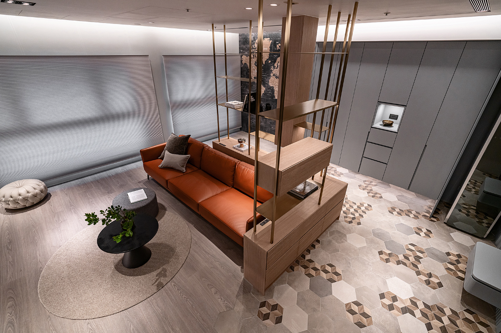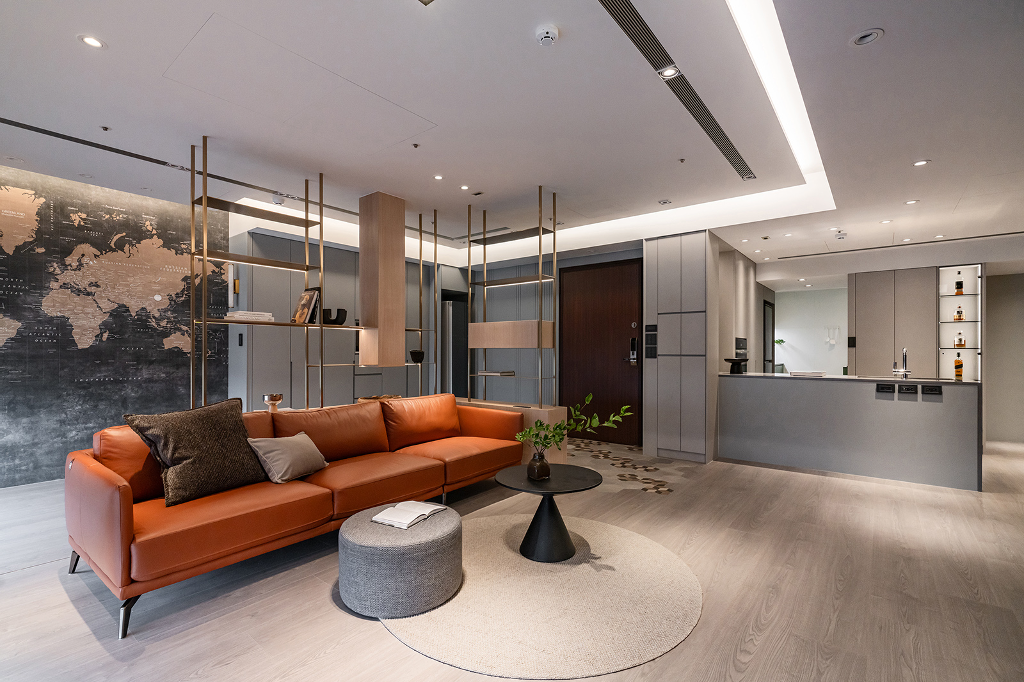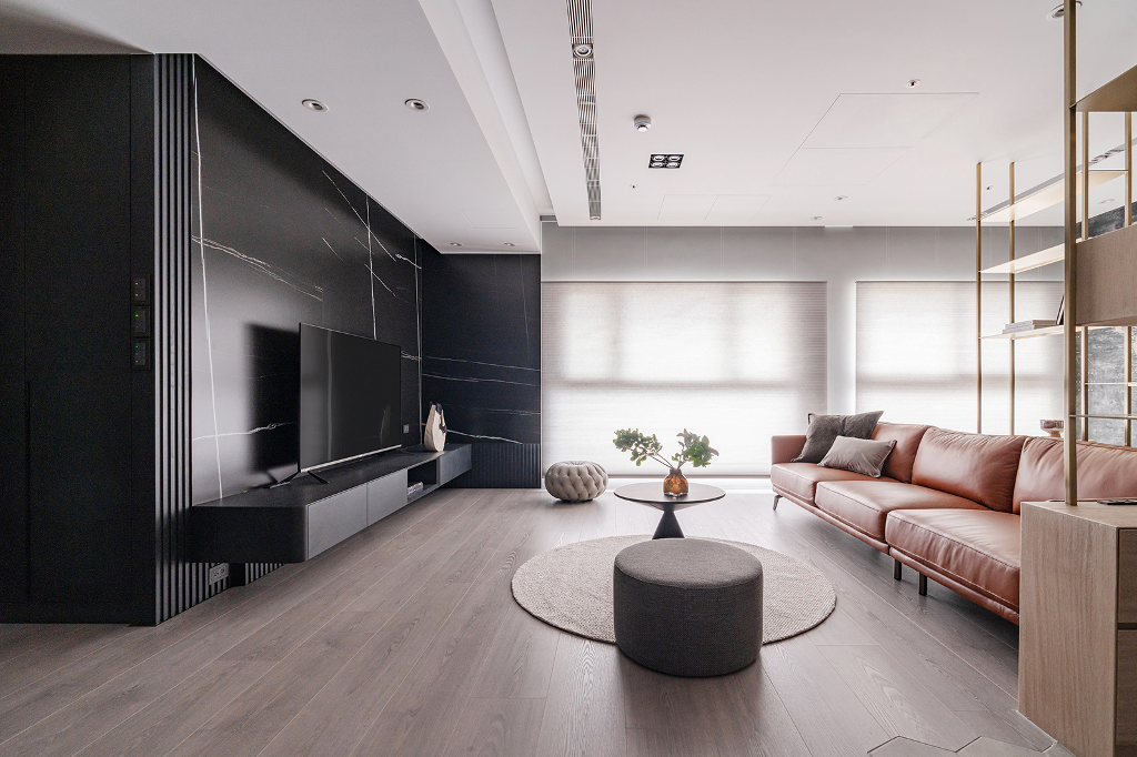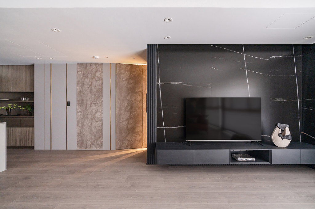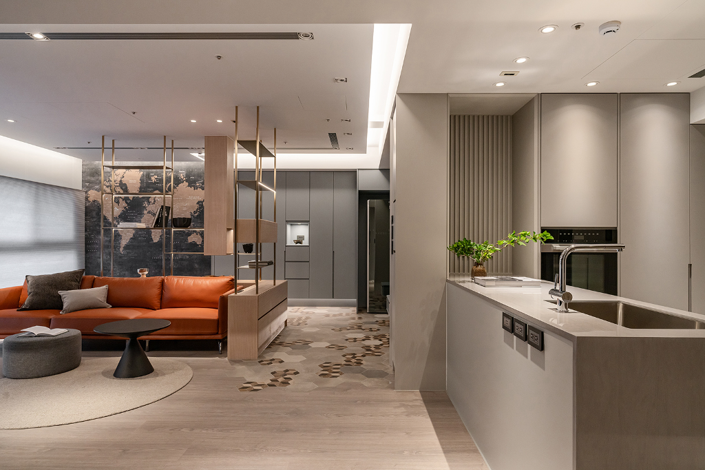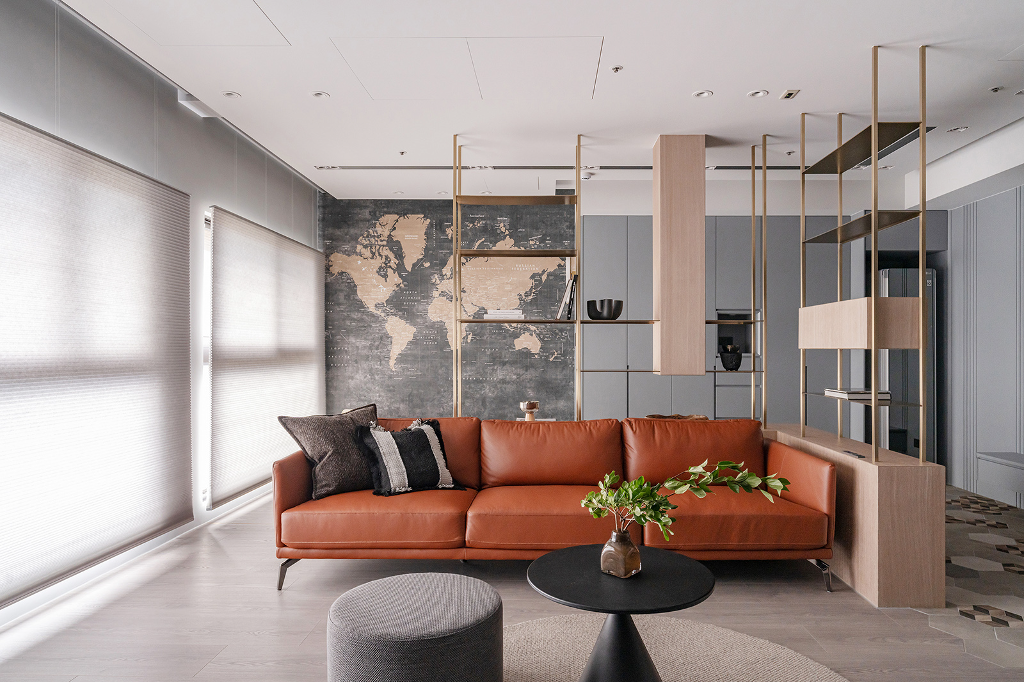 往前來到客廳,猶如來到住家的心臟地帶,設計師以沙發為中心打造室內第一個環形格局,彷彿一座引力場,將各種可愛的元素凝聚在周圍,一旁L型的鍍鈦金屬鏤空層架能夠展示許多男女主人在旅途中收藏的珍貴紀念品,而沙發後方的世界地圖磁吸牆未來將會擺滿從各國蒐集來的磁鐵,讓每一次凝視都成為一場精采記憶的回顧旅程。前方由義大利進口薄板磚打造的電視牆散發低調奢華感,大片落地玻璃窗前安裝電動風琴簾,方便全家人自由控制採光強弱,無形中令整體公領域洋溢舒適大氣的氛圍,輕而易舉達到療癒身心的目的。