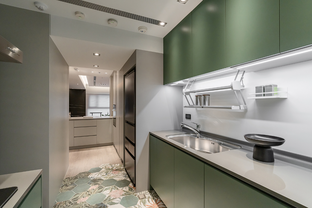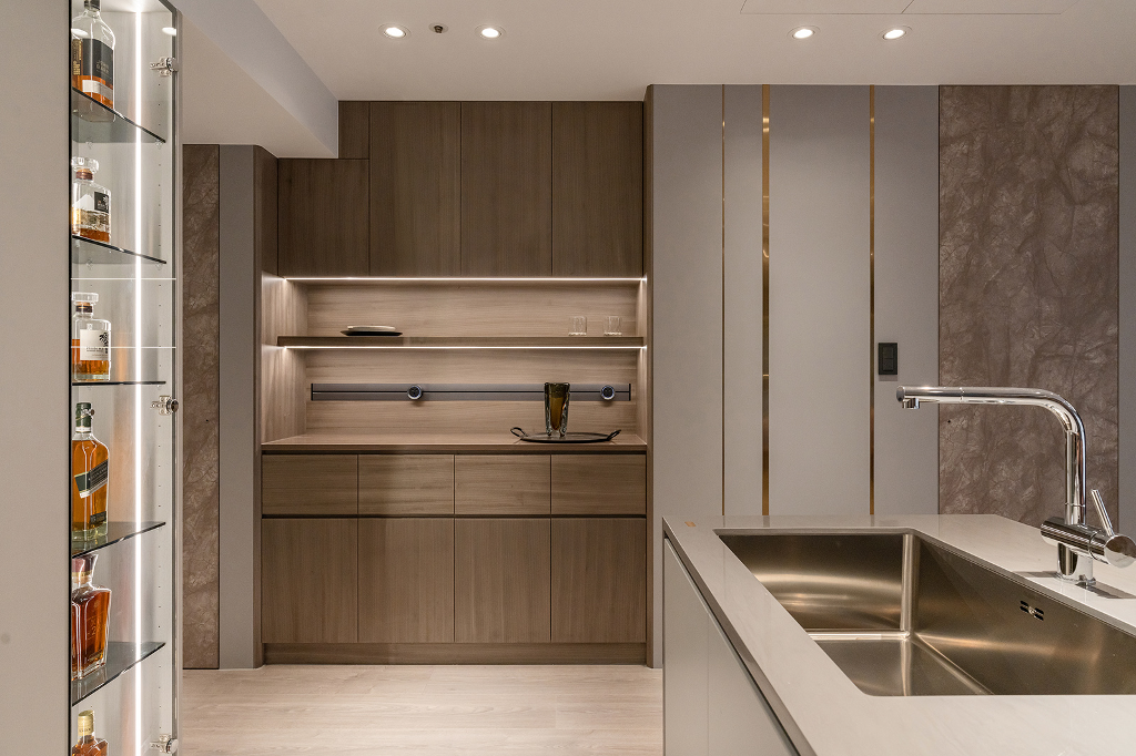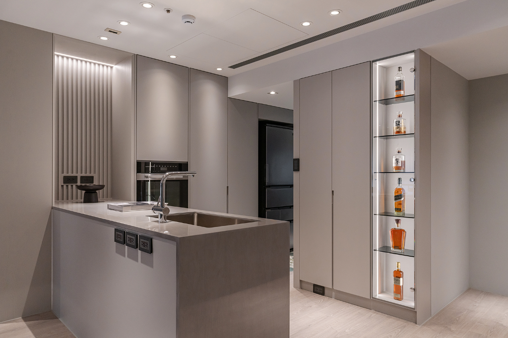 緊鄰在客廳旁的餐廚區在設計師巧妙規劃下,分為熟食區、輕食區與獨立廚房,充分滿足不同使用需求,輕食區設有餐櫥櫃、酒櫃、收納櫃與功能齊全的中島,如同一個小型美食招待台,即使親朋好友輪番到來,都能享有賓主盡歡的愜意時光,且餐櫃還加裝軌道式插座,進一步提升電器充電效率;內廚房則專注於料理與洗滌,透過精心安排的設備如下拉式瀝水架、不鏽鋼流理台、倒T型抽油煙機…等,讓烹飪過程事半功倍。