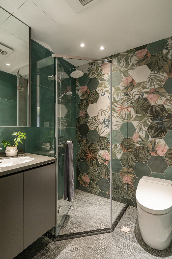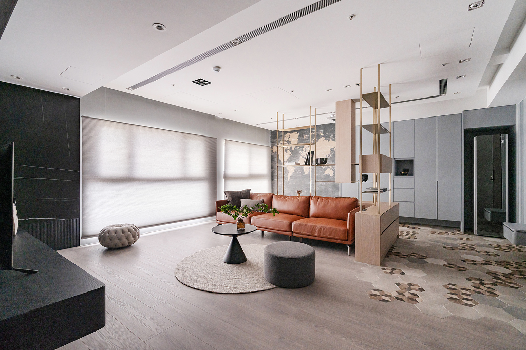 由玄關開始就予人眼前一亮的感受,設計師針對落塵區精心鋪設六角磚與客廳木地板相連結,一方面藉此區隔出內外分界,另一方面也彰顯精緻的工藝品味,同時加裝實用的穿鞋椅、鞋櫃、置物抽屜與電子衣櫥等,替生活增添無與倫比的智慧便利性。