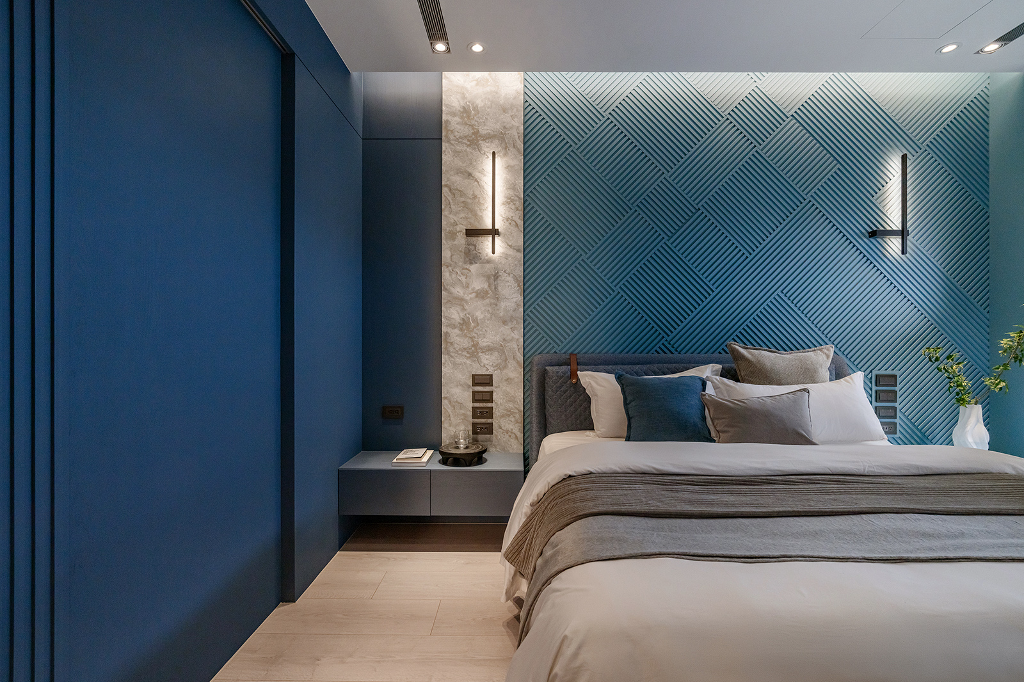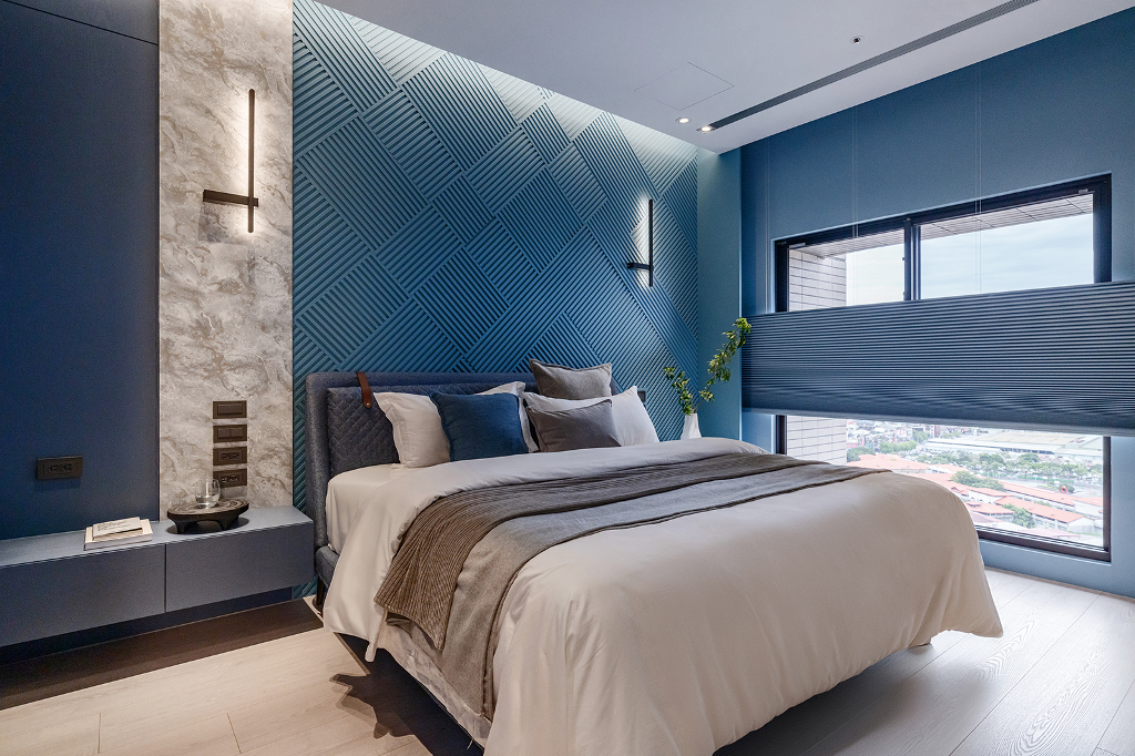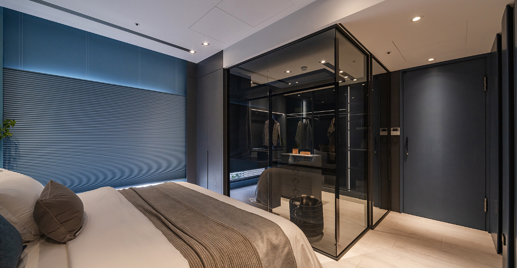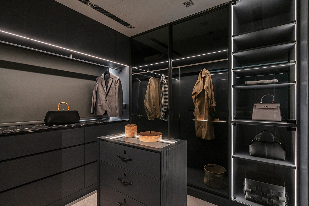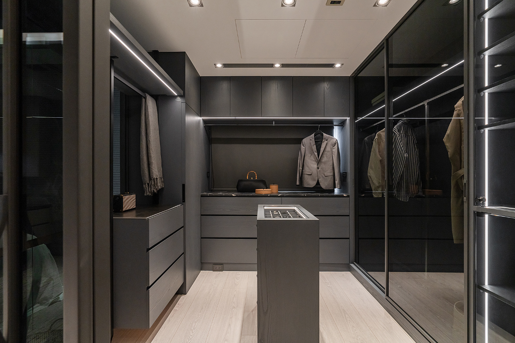 主臥室以藍色為主調,藉由木格柵營造出柔和的布織紋質感,給人一種置身於蔚藍天空下的錯覺,淺藍色象徵天空翱翔的開闊,而深藍色的側牆則突顯夜晚星空的靜謐神秘,替睡眠增添了深層的放鬆感。而男主人的更衣室看似藏在星空中的黑色寶石,閃耀著低調的光芒,採用灰色玻璃與鐵件製成的櫃體不僅外觀時尚利落,還大幅強化了收納功能,內部精心規劃了高級服飾、精品包與名牌手錶的展示區域,充分展現主人的品味與格調,升降式的衣物吊掛系統及LED燈光更是錦上添花,部分櫃體還加裝鎖頭,安全性毋庸置疑,同時藉此讓整體空間散發出董事長級的軒昂氣度。
