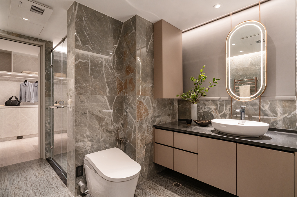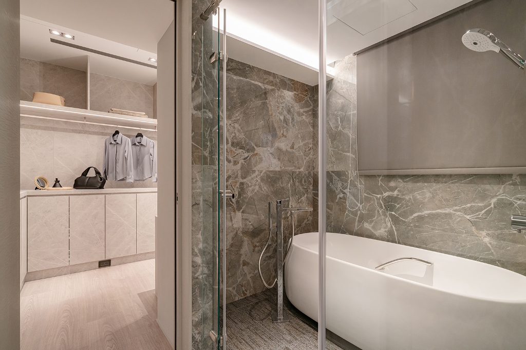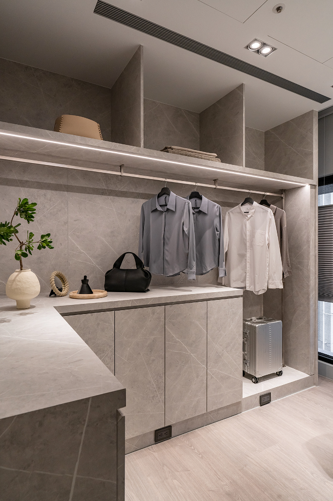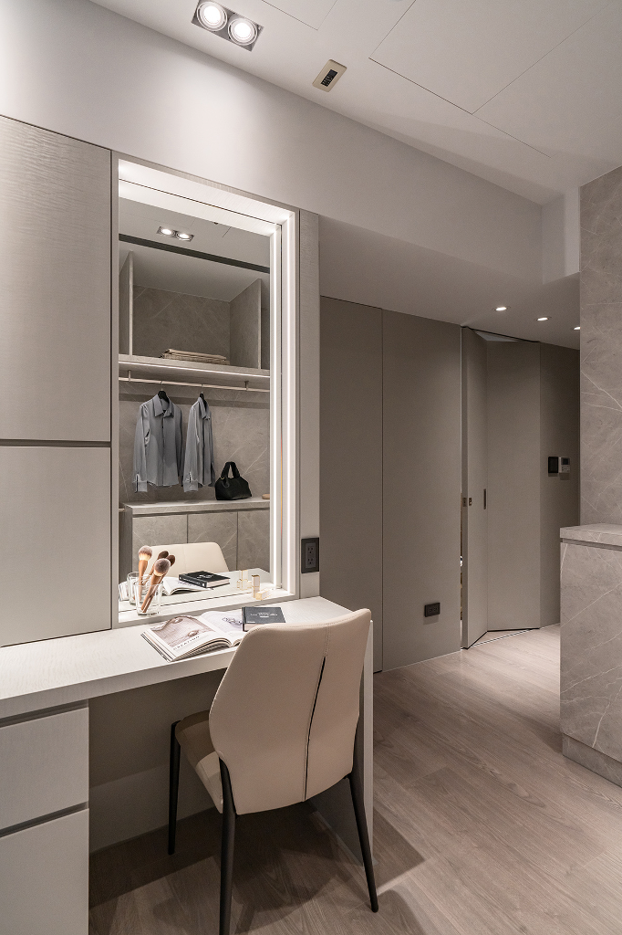 女主人更衣室則如羽毛般輕盈搖曳,傳遞柔美溫和的氣氛,這裡除了有著儲物效能強大的衣櫃外,更針對使用者個人生活習慣規劃了行李箱區與保養品置放櫃,同時化妝桌鏡面的側燈光設計媲美明星專用化妝室,確保妝容完美無瑕。而主浴特意選用義大利米瑞石,抽象描繪出高山峰頂的壯觀,令每一次沐浴都成為身心的洗禮,並且浴室內的鏡面也比照化妝鏡的照明配置由正面打光,於是照鏡子時臉上再不會產生任何惱人陰影,正如這個家一樣,身處其中,所有煩惱思緒都將一掃而空,只有層出不窮的幸福伴隨著往後益發精彩的璀璨人生。