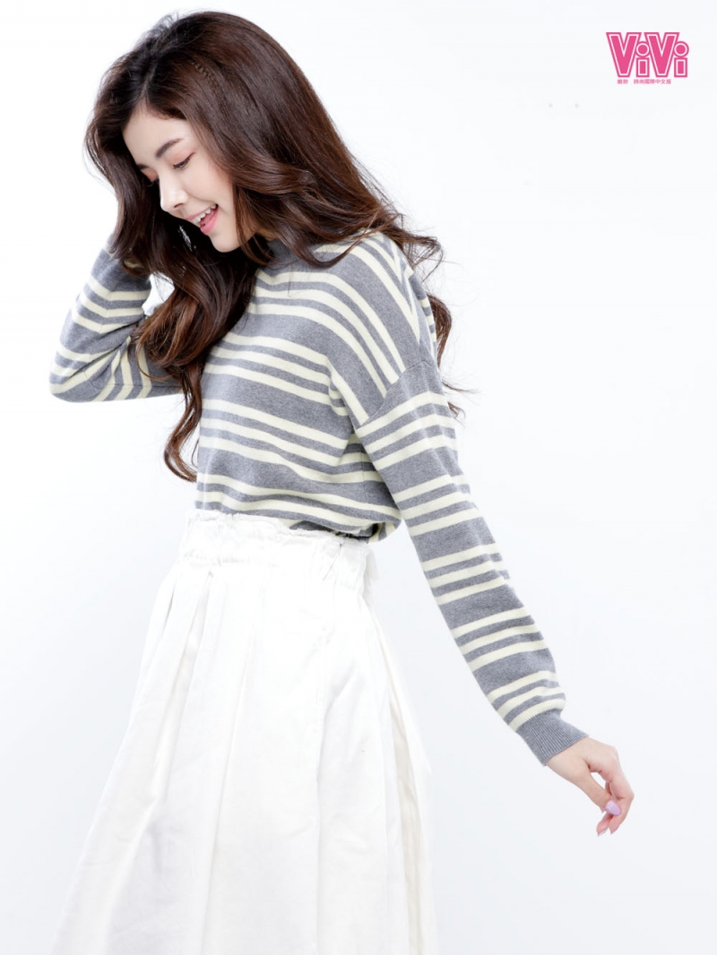 想要打造與眾不同的女孩風格,可以挑戰流行上級者的牛奶粉黃色!!擔心太過突兀的話,可以選擇局部色彩的單品開始投入就不會困難。 粉黃×灰條紋小高領上衣 NT.1980/KBF 白色不收邊丹寧及膝散襬裙 NT.1590/ZARA