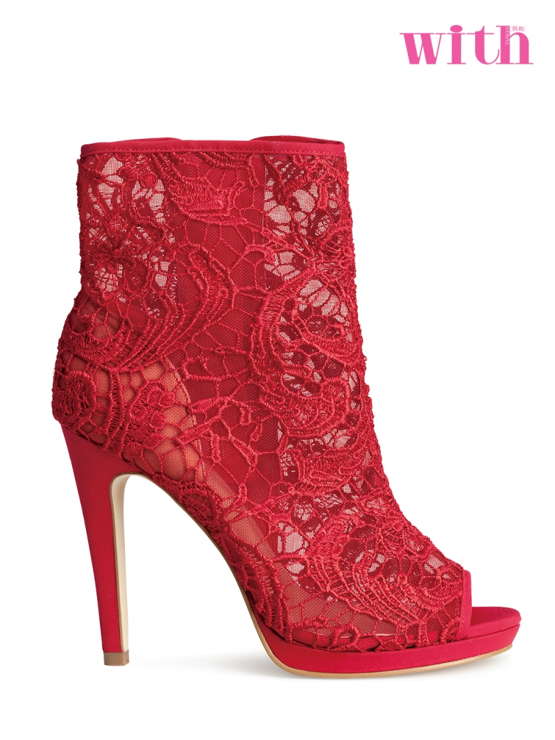 圖說:夢幻蕾絲也是今年主打流行,注入紅色更顯貴氣。紅色蕾絲高跟踝靴 價格電洽/H&M
