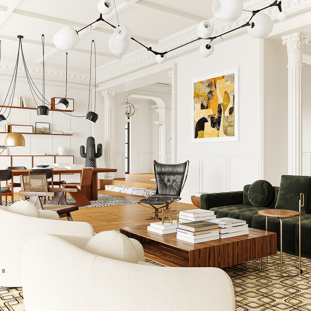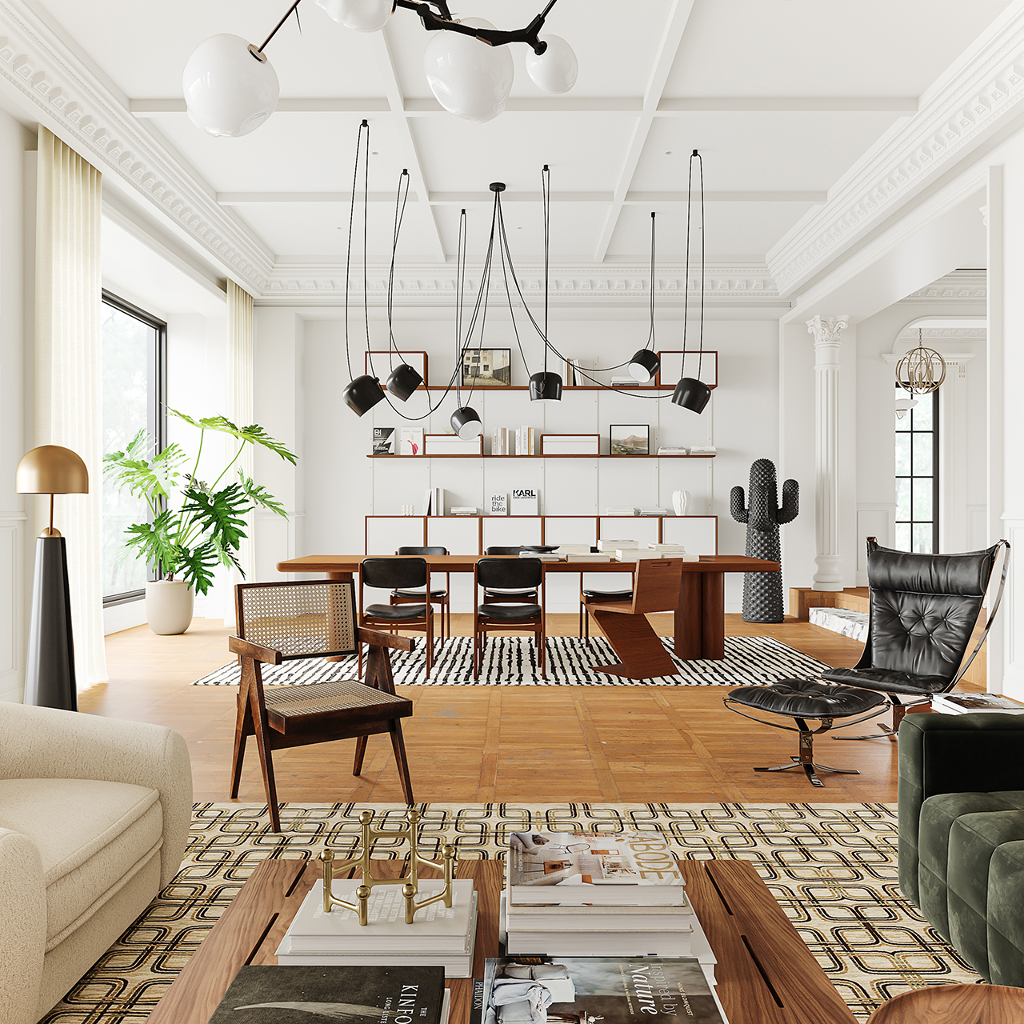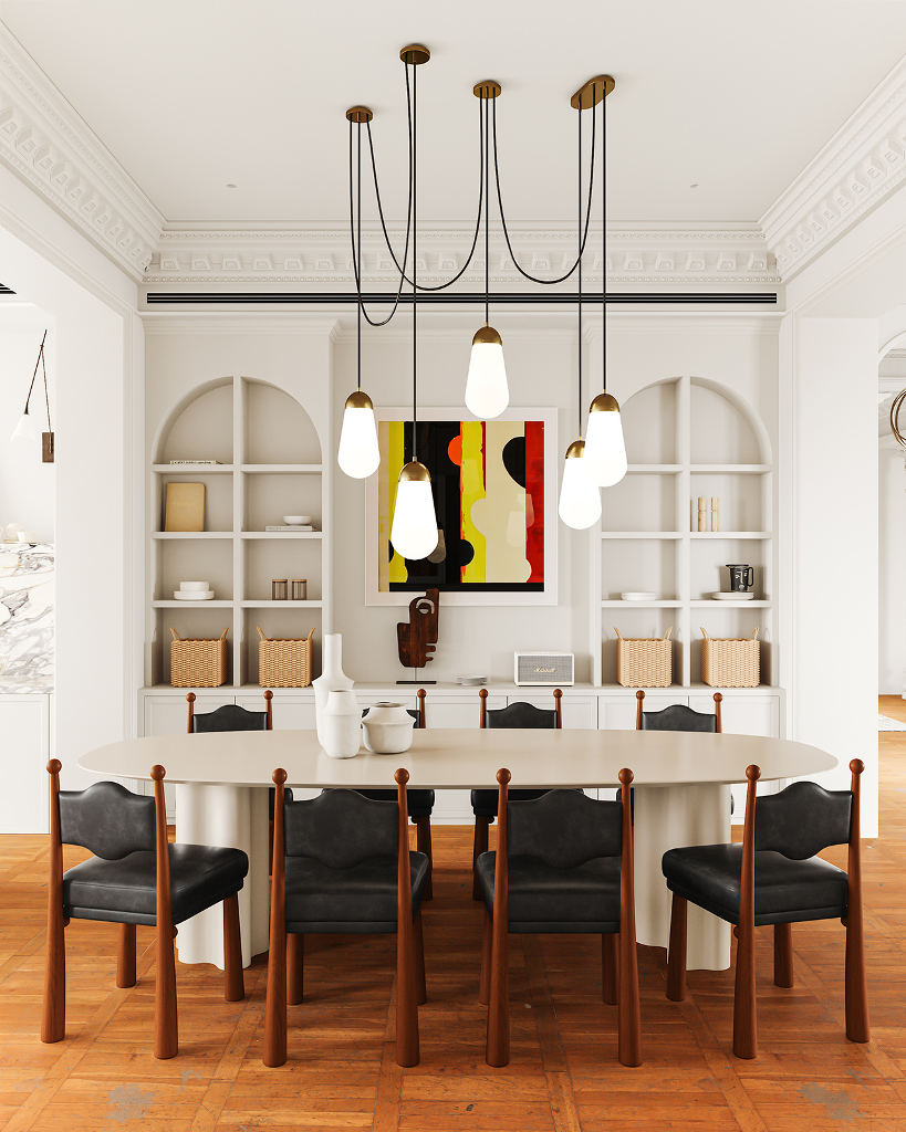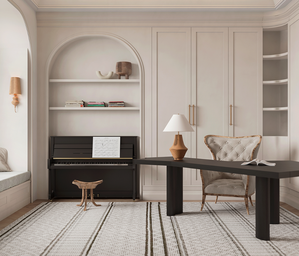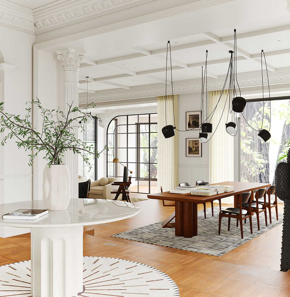 由踏入玄關的第一步,就已經能感受到對稱且大氣的豪宅風範迎面而來,長廊的拱頂設計、室內的天花雕花與羅馬柱,不僅增添了空間層次,別具懷舊復古氣息,也巧妙呼應古典美學的精緻細節。來到客廳,實木地板搭配表面繪製特殊紋路的地毯,突顯舒適且不落俗套的視覺效果,精選家具、大型吊燈、高彩度畫作及造型各異的藝術品以看似隨興愜意的方式散落於公領域各角落,在實用與美觀之間達到完美平衡,更一舉帶出居家環境的活潑生命力,搭配純白素雅色調與開放式格局,讓面積廣達600平方米的宅邸尤顯開闊寬廣。