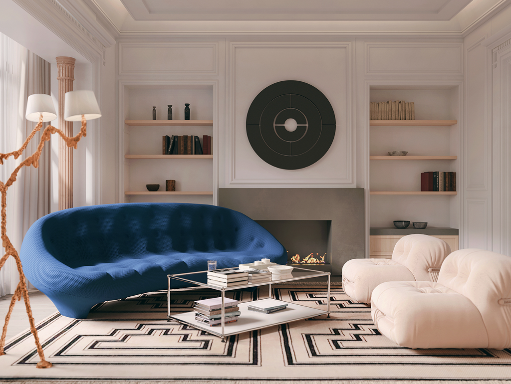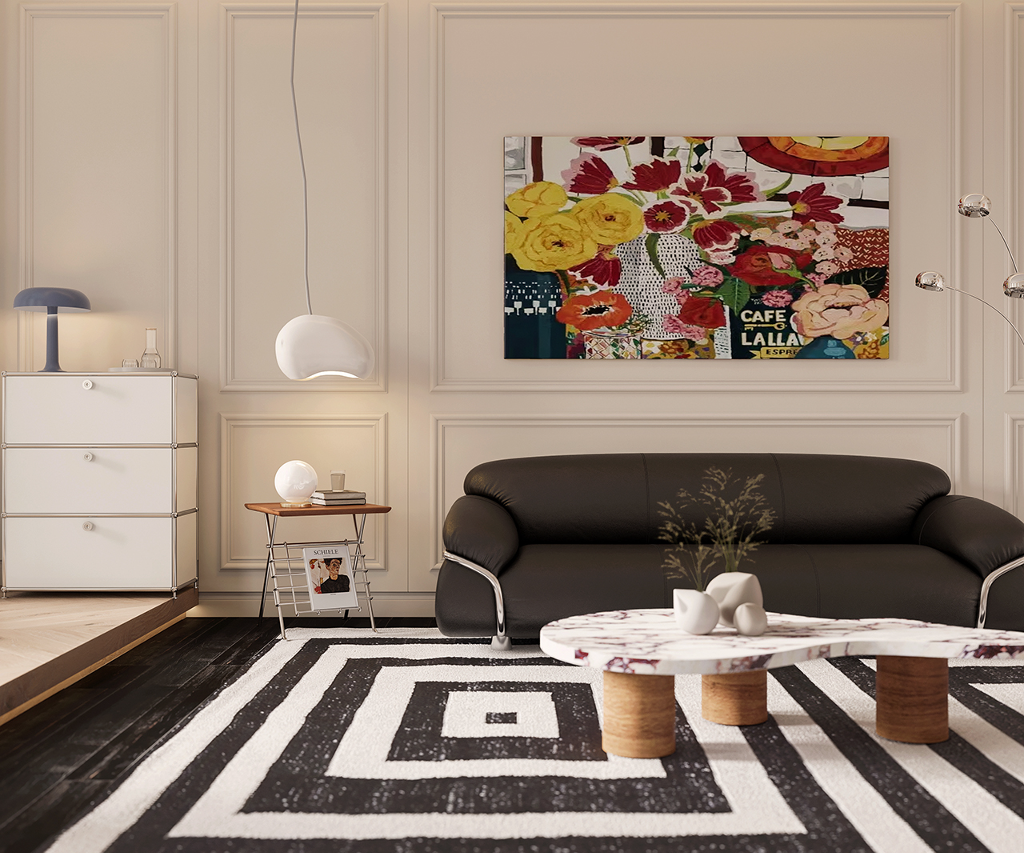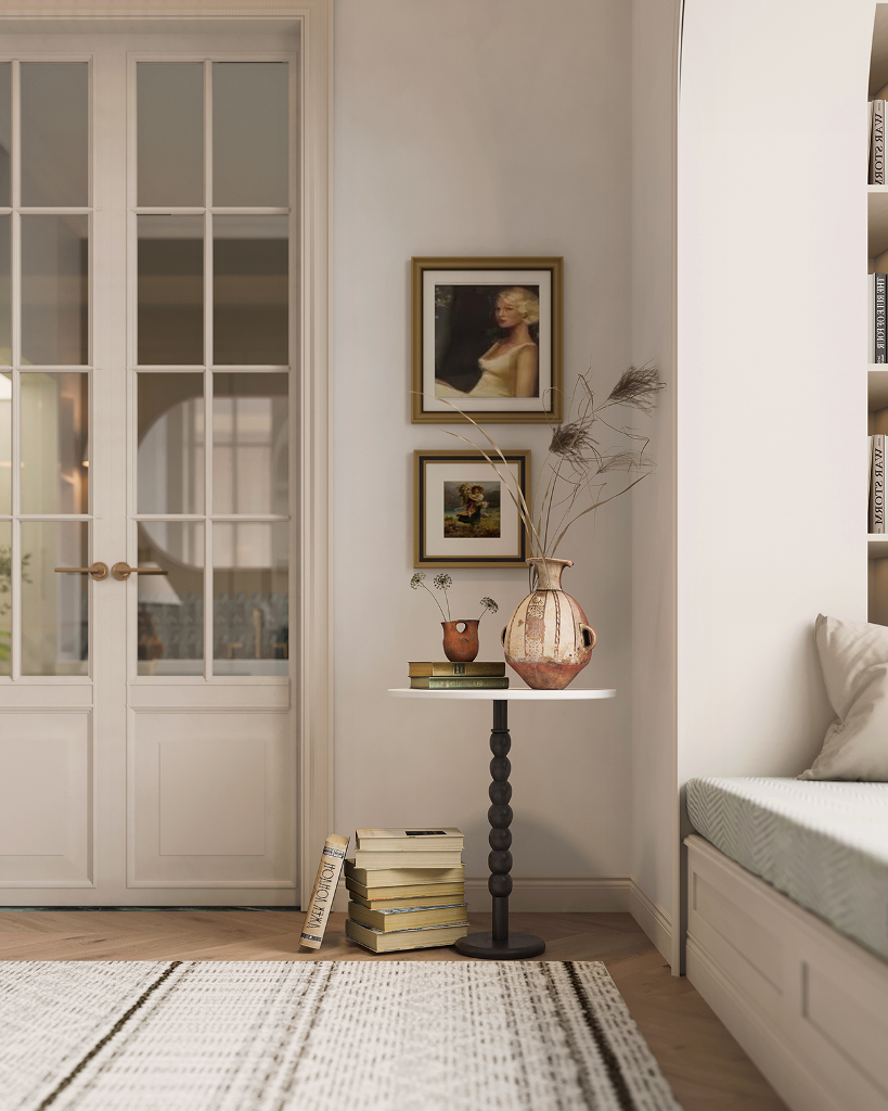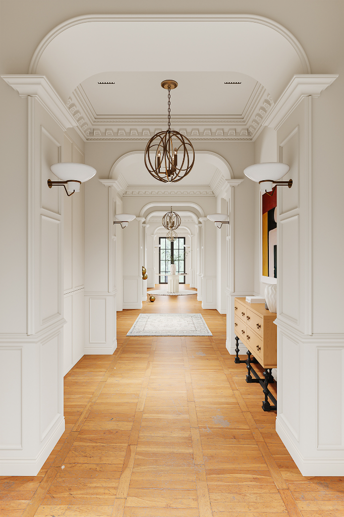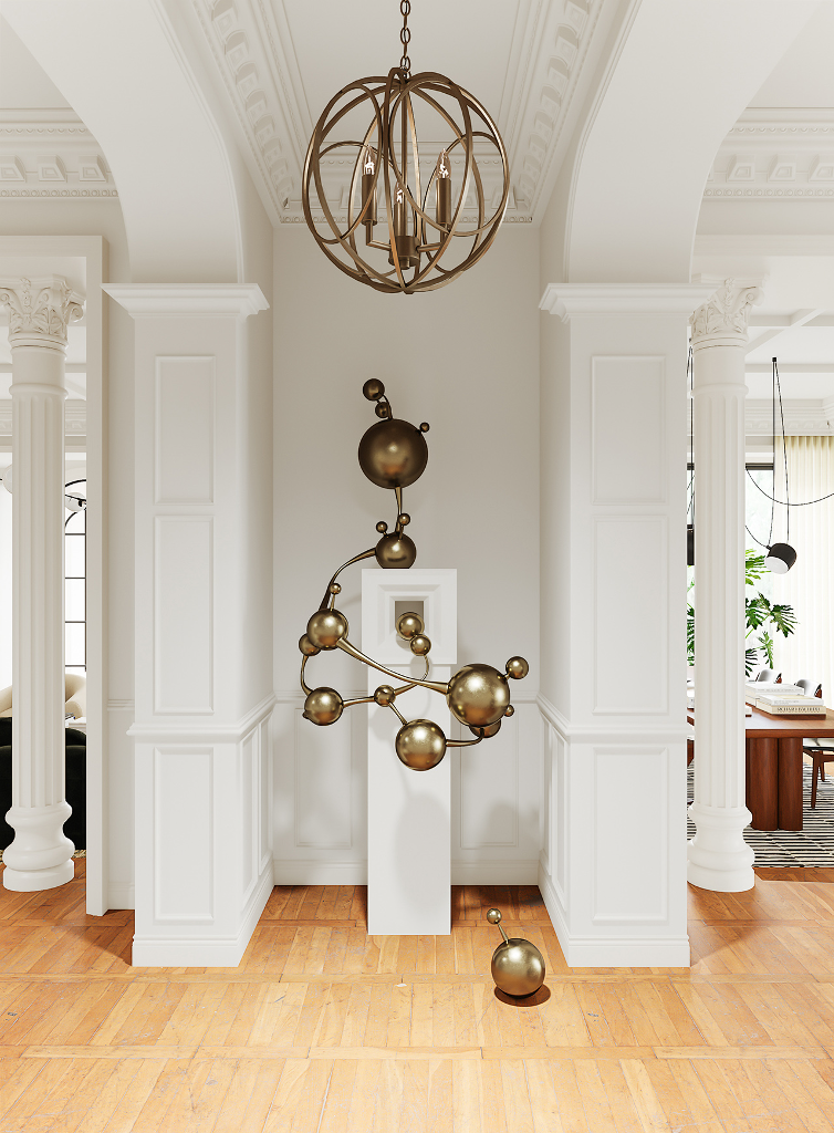 由踏入玄關的第一步,就已經能感受到對稱且大氣的豪宅風範迎面而來,長廊的拱頂設計、室內的天花雕花與羅馬柱,不僅增添了空間層次,別具懷舊復古氣息,也巧妙呼應古典美學的精緻細節。來到客廳,實木地板搭配表面繪製特殊紋路的地毯,突顯舒適且不落俗套的視覺效果,精選家具、大型吊燈、高彩度畫作及造型各異的藝術品以看似隨興愜意的方式散落於公領域各角落,在實用與美觀之間達到完美平衡,更一舉帶出居家環境的活潑生命力,搭配純白素雅色調與開放式格局,讓面積廣達600平方米的宅邸尤顯開闊寬廣。