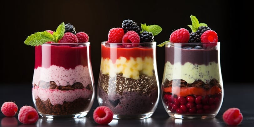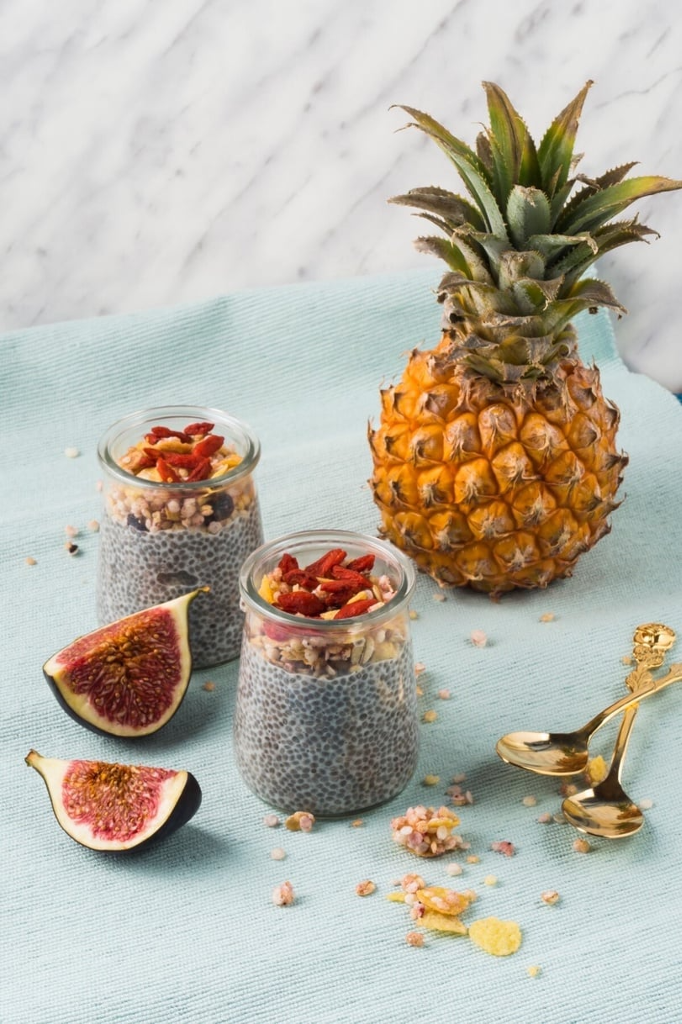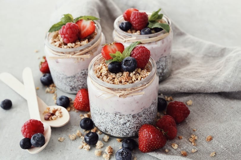 食材:奇亞籽、牛奶、可可粉、無糖優格、香蕉、藍莓